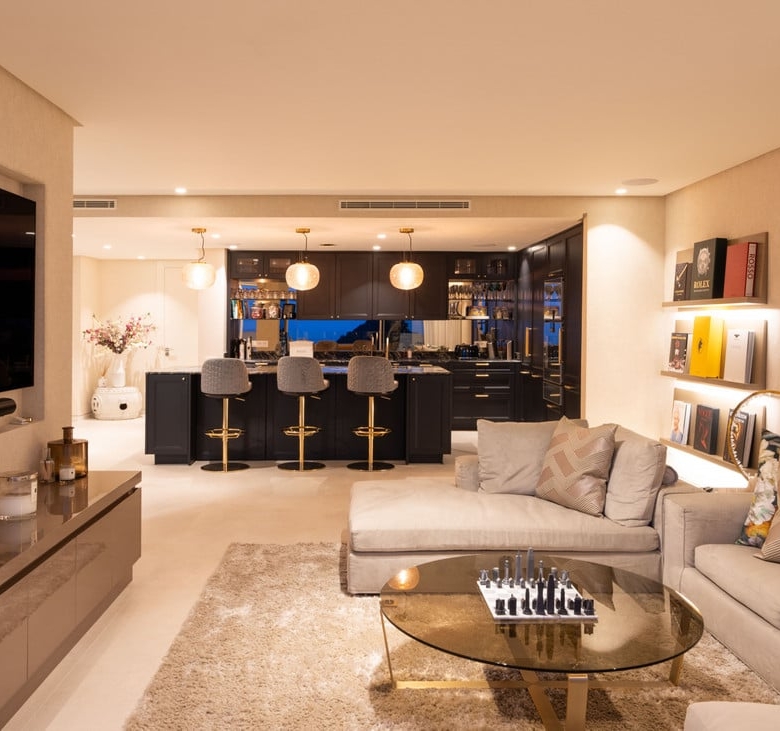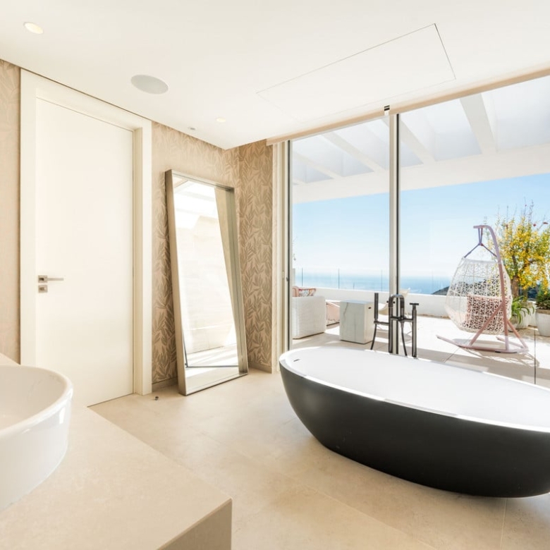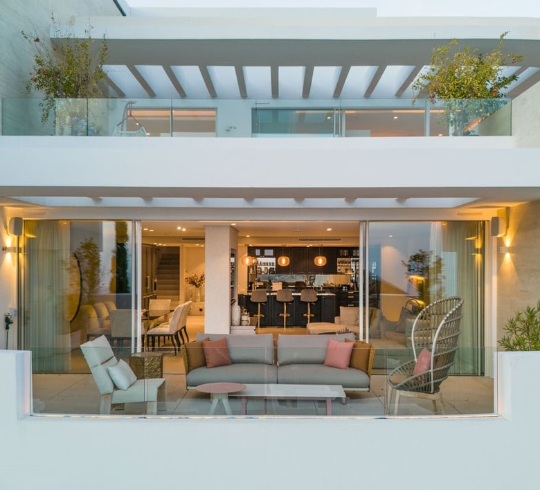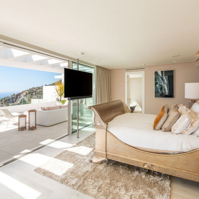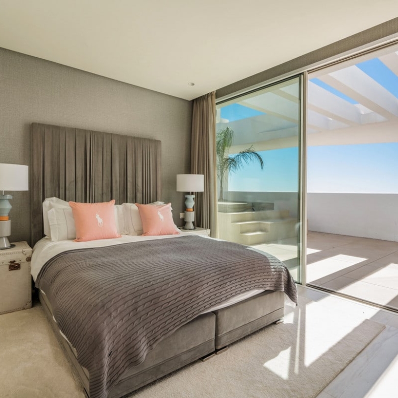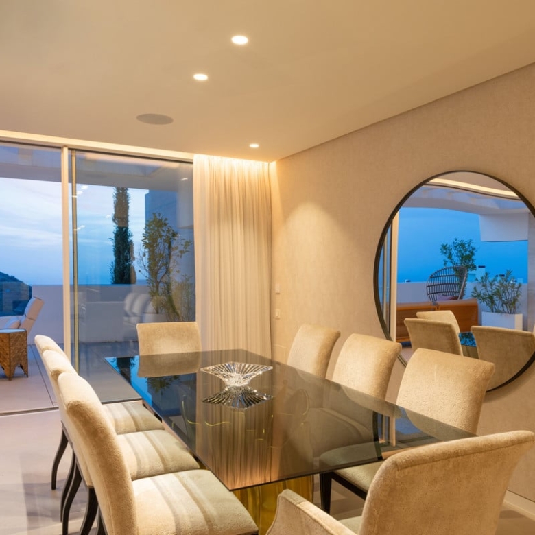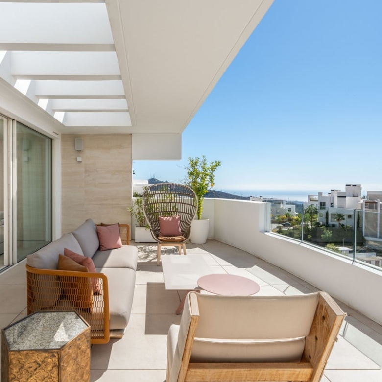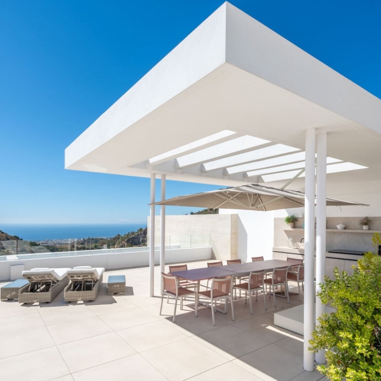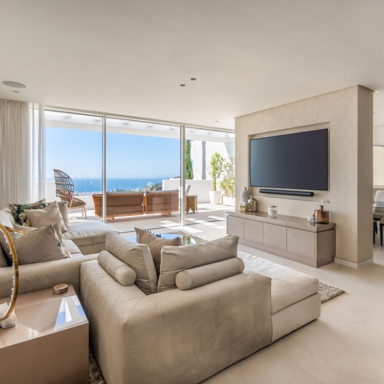 Surrounded by nature and high-end properties, this south-facing triplex penthouse spans 275 m2 and is designed to impress. Built to the highest specifications, it combines modern aesthetics with utmost comfort and functionality. The main level, initially designed as a 3-bedroom apartment, now features an open-plan concept uniting a stylish living room, dining area, and sleek kitchen with an island and bar, creating a spacious area perfect for entertaining. Wide sliding windows and glass doors ensure a seamless connection between indoor and outdoor spaces, flooding the interior with natural light. The fabulous 107-m2 terrace allows residents to fully enjoy the fantastic sea and mountain views and the exceptional Costa del Sol climate.