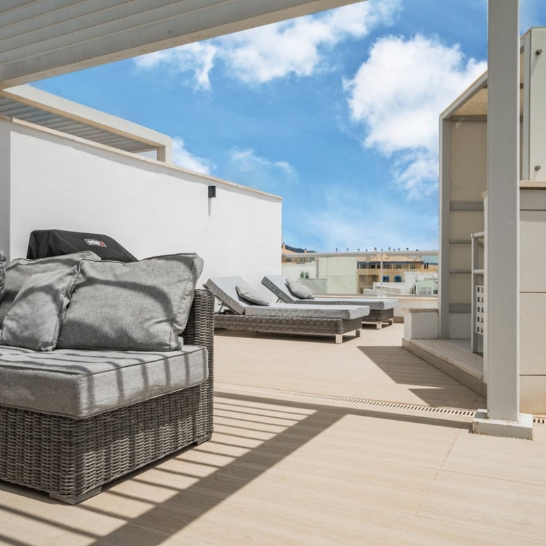 From the living room you reach the first terrace, perfect for relaxing in the shade. Upstairs you will find the large roof terrace with an elegant lounge group and sun loungers, where you can enjoy the sun and the fantastic sea view.
