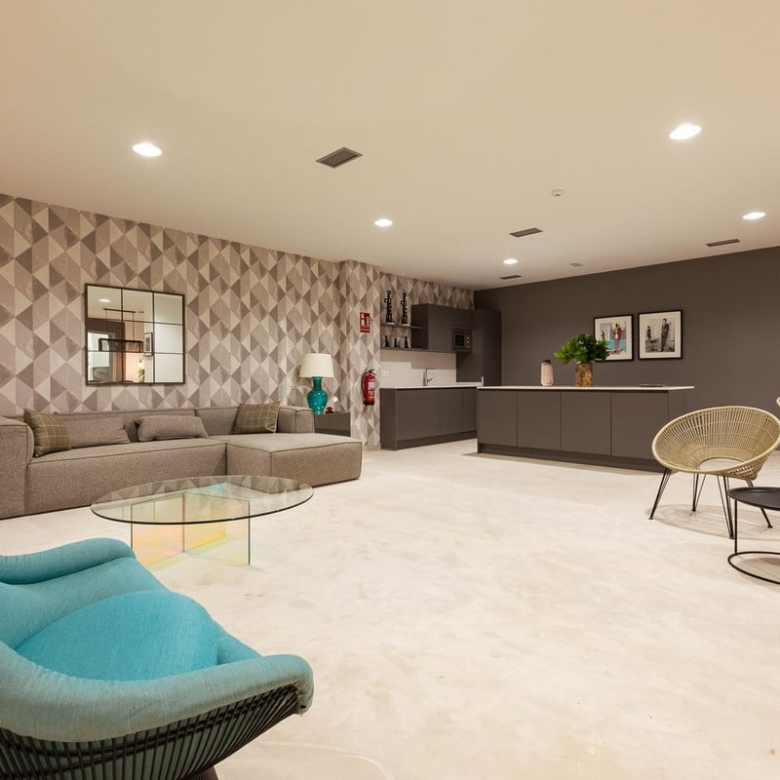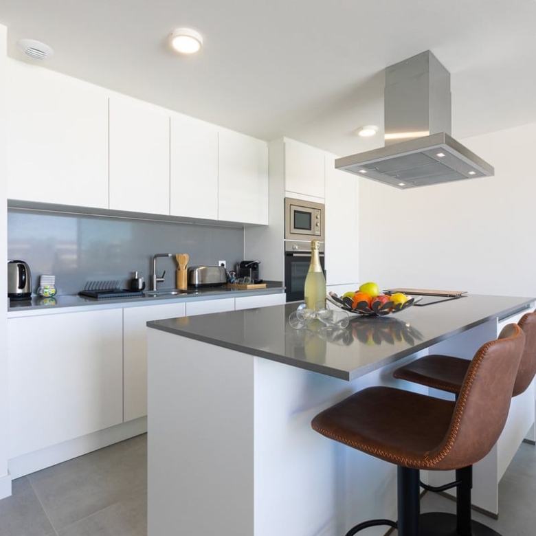 This south-west facing penthouse is flooded with natural light, thanks to expansive windows and glazed surfaces that create a bright, welcoming atmosphere. The downstairs terrace, overlooking lush community gardens and an inviting pool, seamlessly blends indoor and outdoor living in an open-plan layout that defines both comfort and functionality.