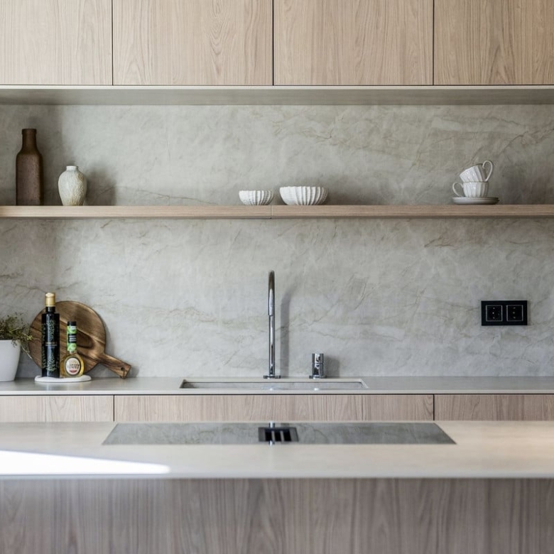 Entering the living area, you are greeted by a bespoke kitchen that exudes both elegance and functionality. it features stunning deep wooden accents on the island and cupboards, complemented by a soothing ‘Taj Mahal’ marble countertop. With ample storage, generous counter space, and a wine cooler, it is a modern kitchen that is incredibly functional for those who enjoy cooking and gatherings. The living room area is warm and inviting, featuring a majestic TV-wall with a spacious bench that offers ample storage.