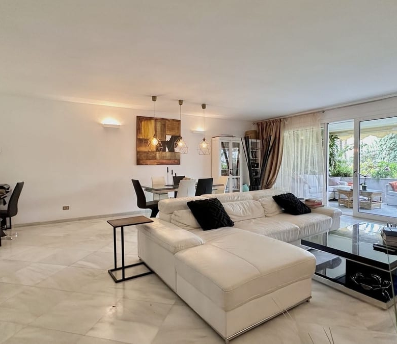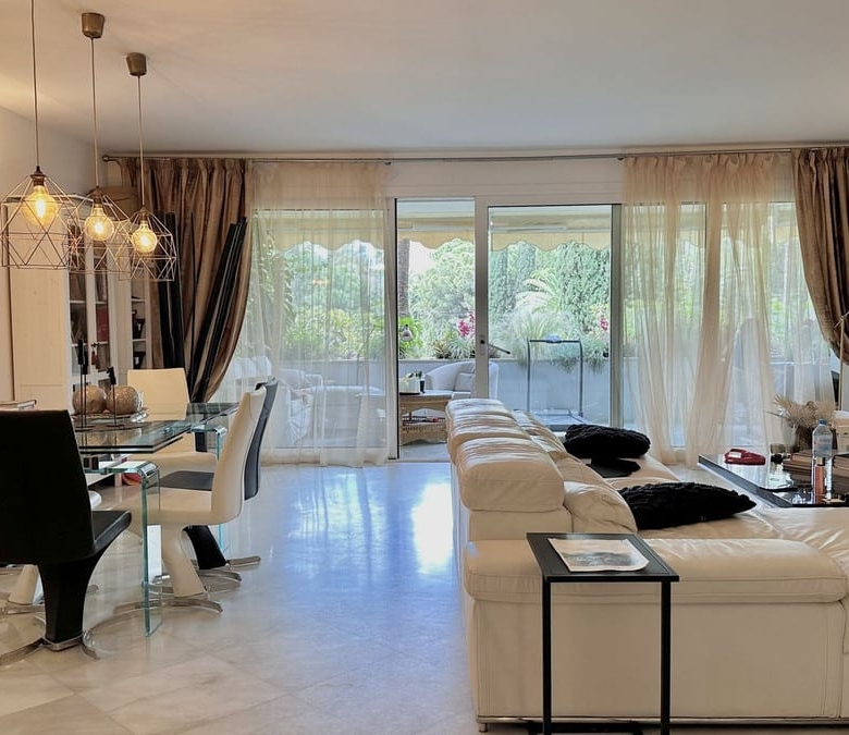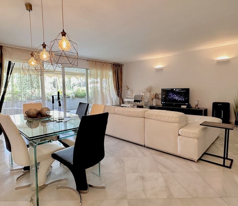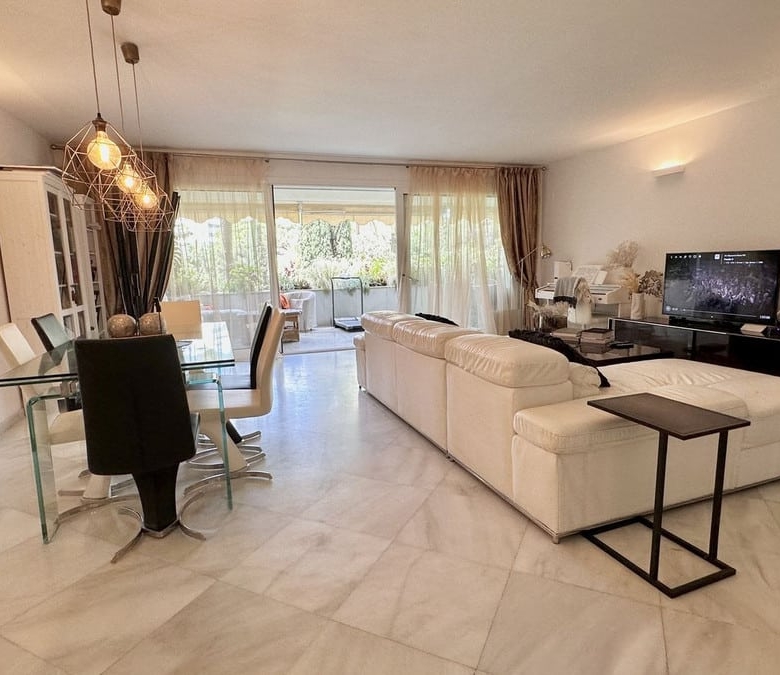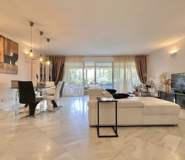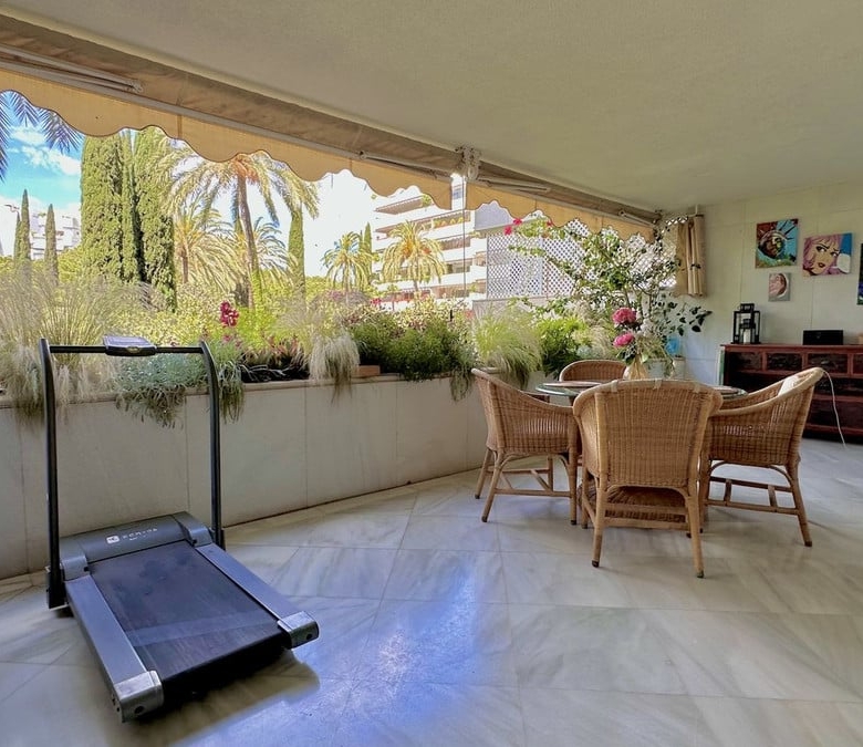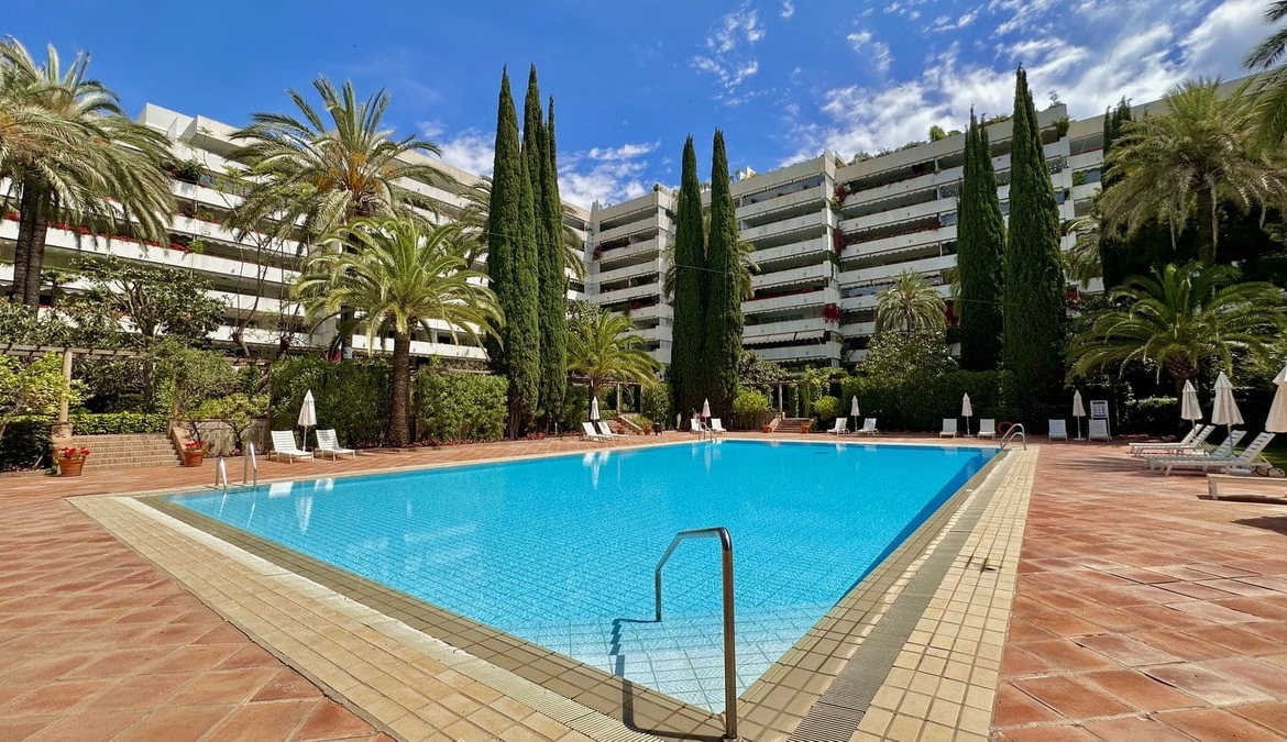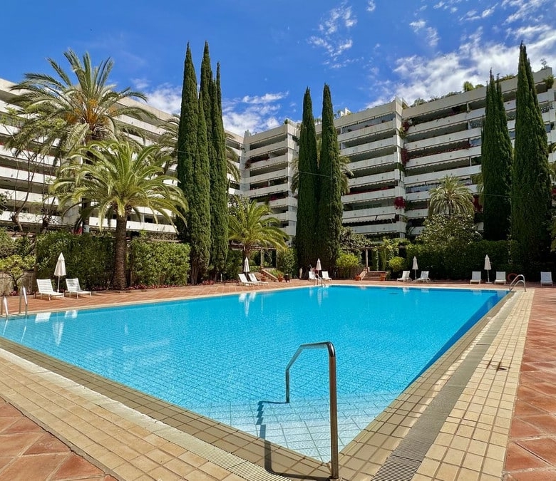 Beautiful and very private apartment in the prestigious complex, located in the center of Marbella, on the second line of the beach and the famous Paseo Maritimo. The complex offers beautiful gardens with two swimming pools, one for children, 24 hour security and concierge service. There is als a new gym with SPA under construction. The apartment offers beautiful views to the garden and pool and has West orientation, it consists of an entrance that leads to the large living room with access to the terrace, the renovated kitchen with the laundry room, the master bedroom en-suite with access to the terrace, two other bedrooms with their bathrooms. The bathrooms are renovated. An ideal property for investment, permanent or vacation residence.