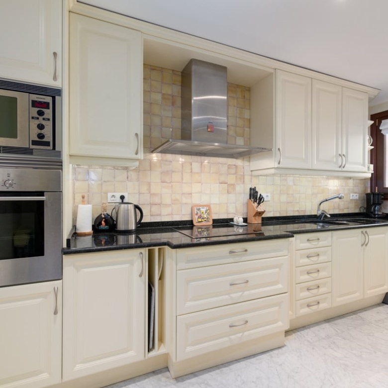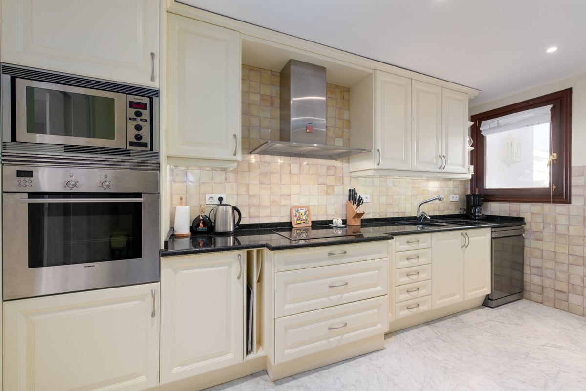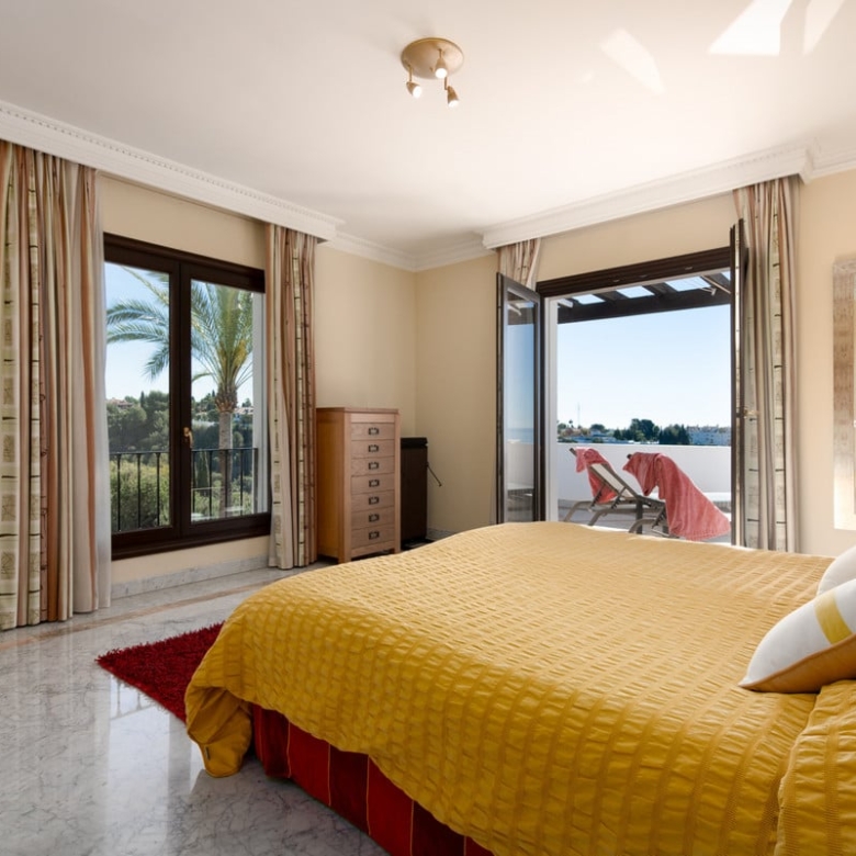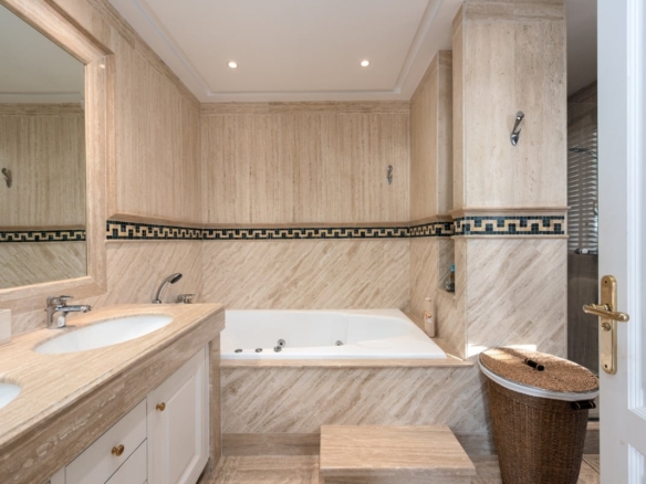 The property is classically appointed and comprises a large lounge with open fireplace, as well as three double bedrooms, each with its own ensuite bathroom; including the owners’ bedroom suite which offers sea views and direct access to the terrace, as well as an oversize bathroom with jacuzzi bathtub, double basins and a walk-in shower, as well as a separate dressing area. There is a fully equipped kitchen which has Siemens appliances, a double American fridge, and a separate utility room with its own small terrace.