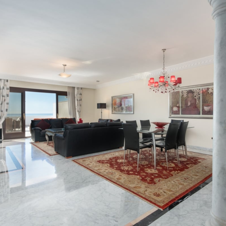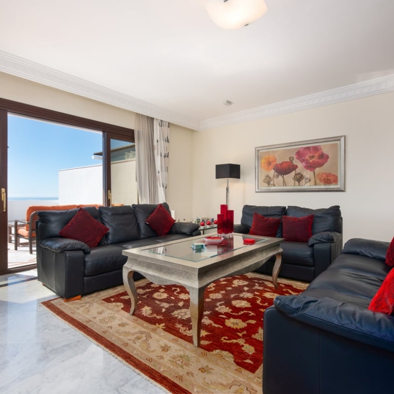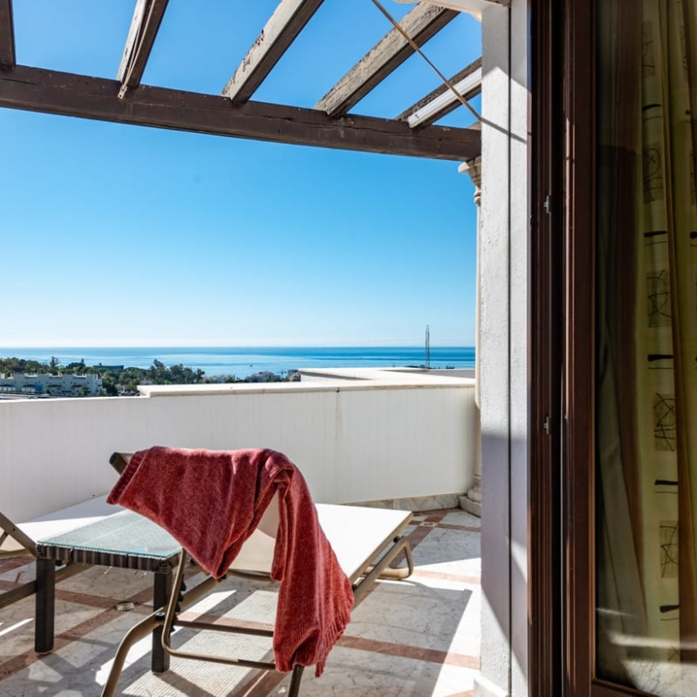 Spacious first floor apartment with panoramic sea views, three double ensuite bedrooms, a large lounge, separate kitchen and utility room, as well as a large terrace. Centrally located within a high end urbanisation within walking distance of the amenities of Marbella old town, in one of the best areas of the Costa del Sol, the apartment boasts impressive views, and oversize rooms throughout.