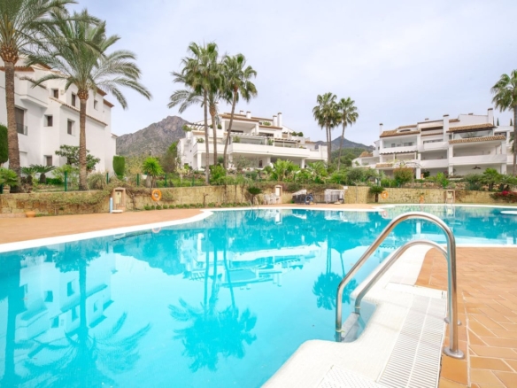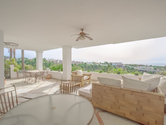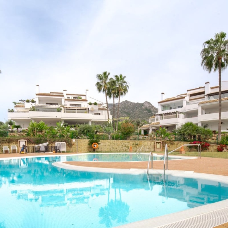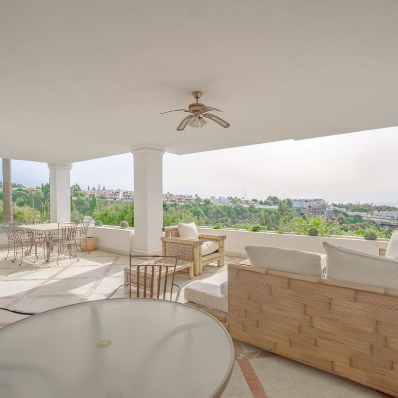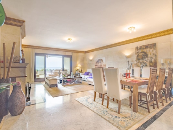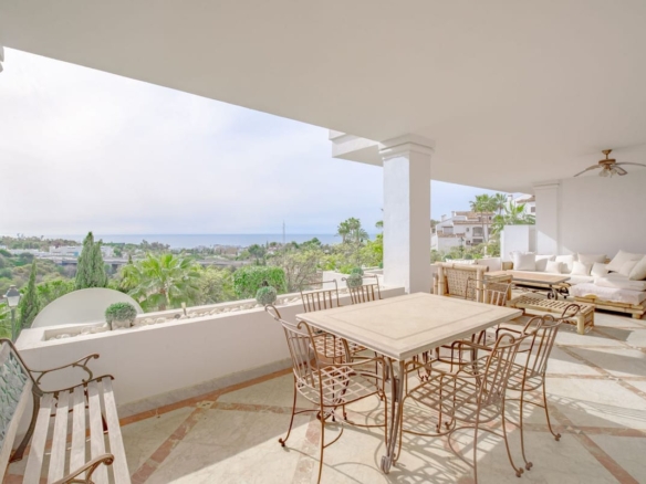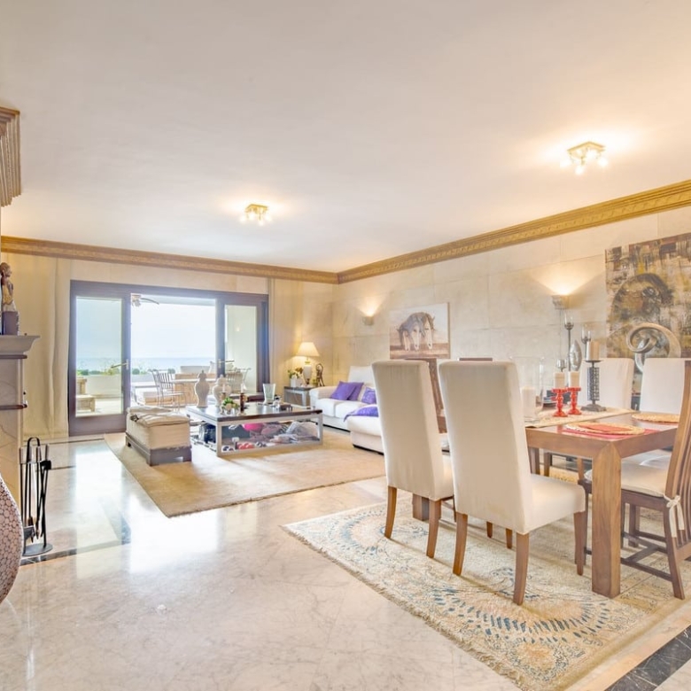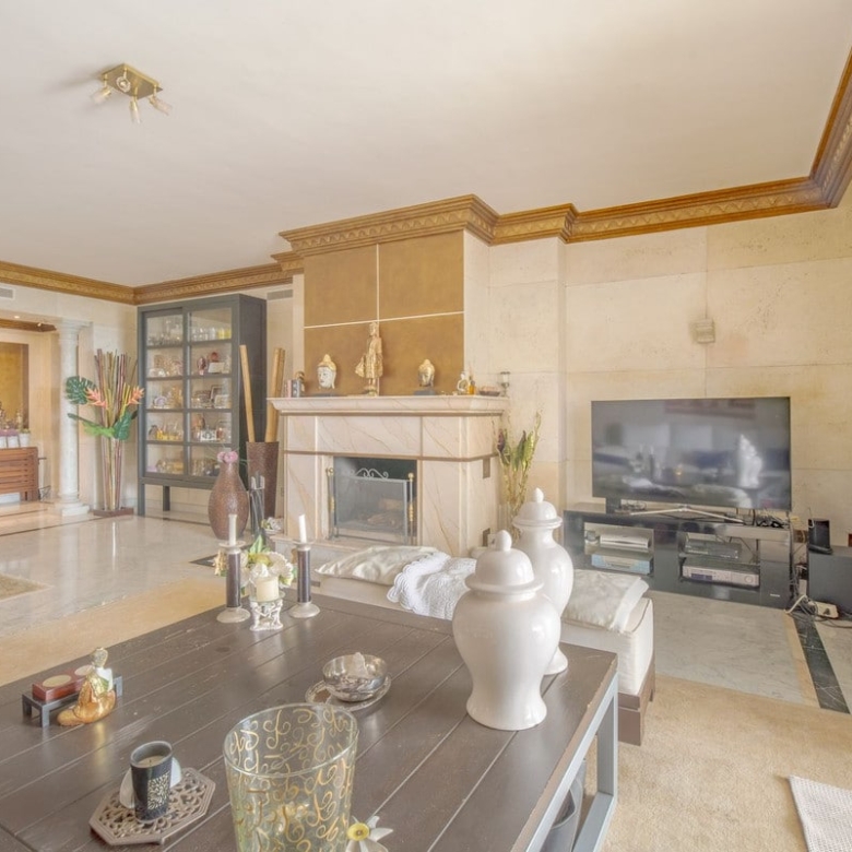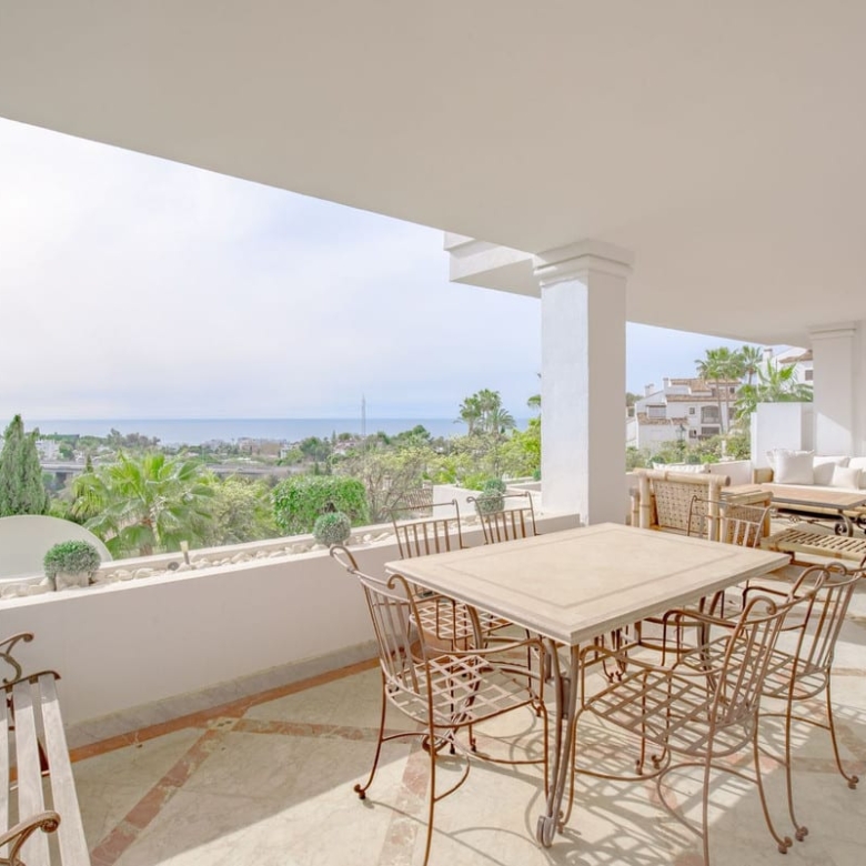 Discover refined living in this elegant ground floor apartment situated on The Golden Mile in Monte Paraiso Country Club. Offering a spacious layout with 3 ensuite bedrooms a wide living room with fire place and a comfortable covered terrace boasting open sea views. The kitchen is fully equipped and there is a separate laundry room. Every suite has plenty of built in wardrobes and there is also a separate bathroom for guests.