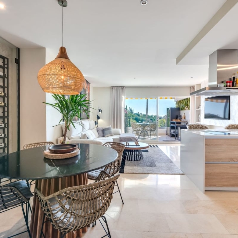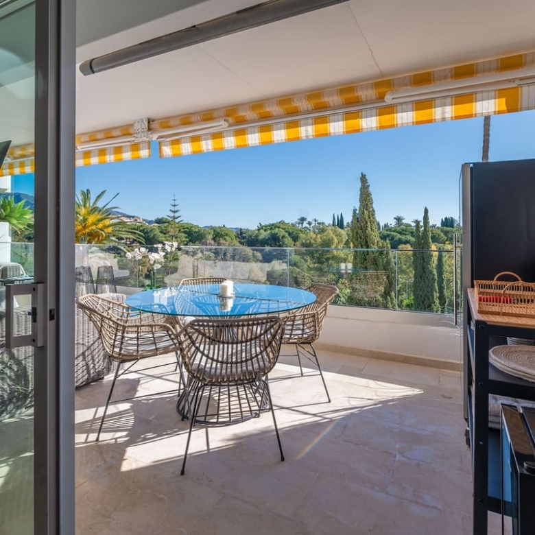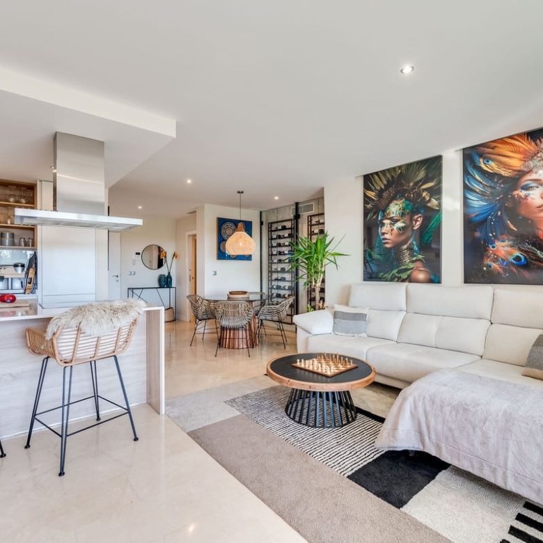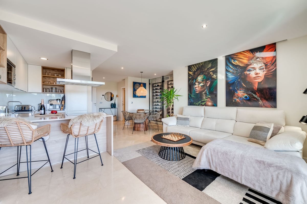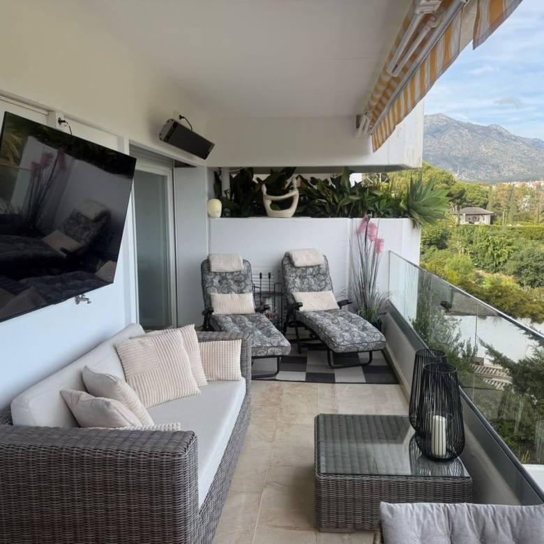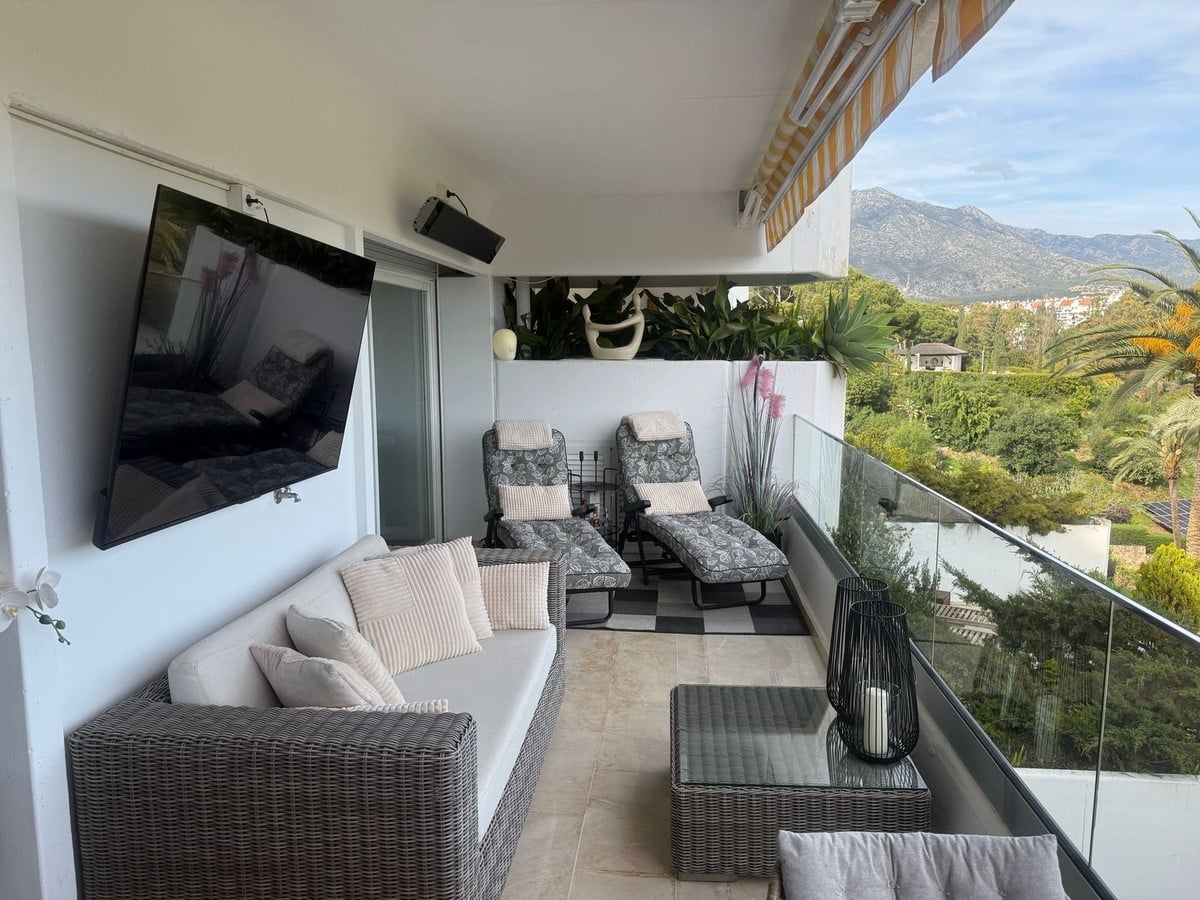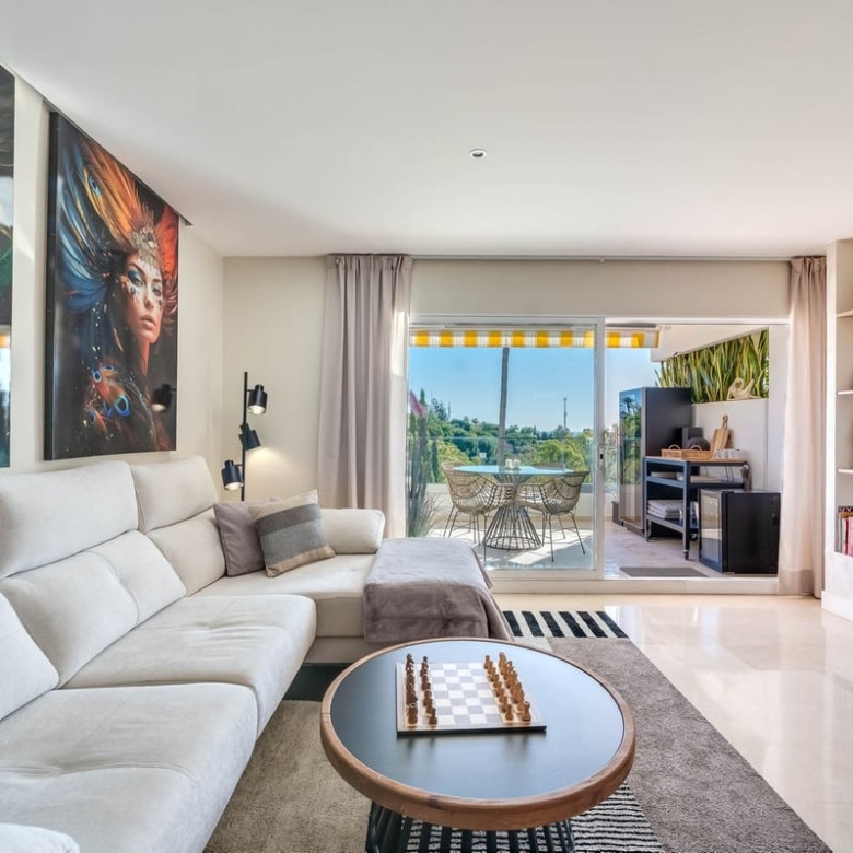 This bright apartment has been completely refurbished and is situated in the prestigious urbanization of Las Terrazas de Marbella Club on the Golden Mile of Marbella. The property boasts 129 m2 of built space and an additional 20 m2 terrace, located on the first floor of the building.