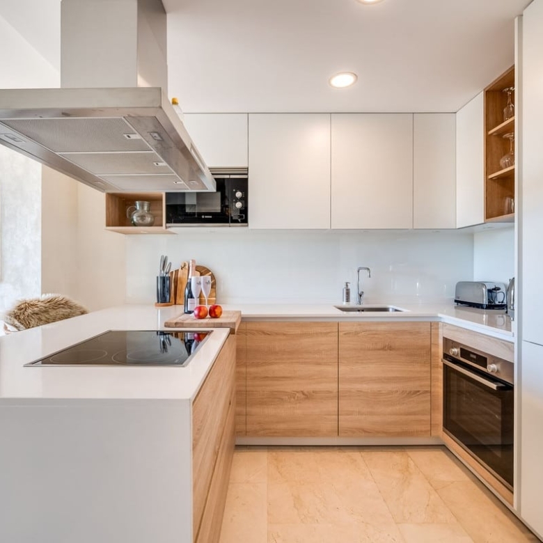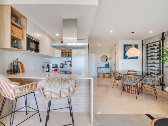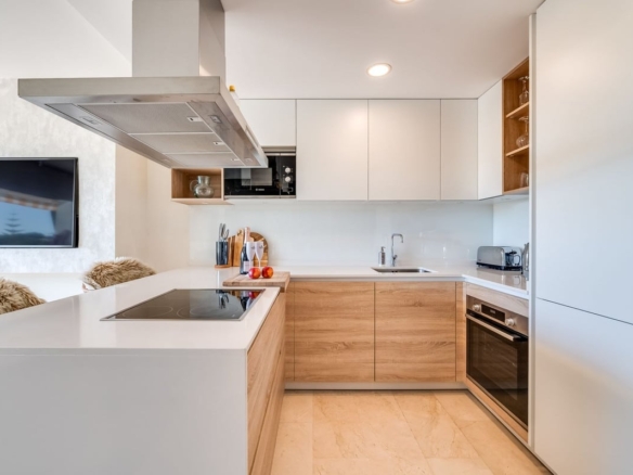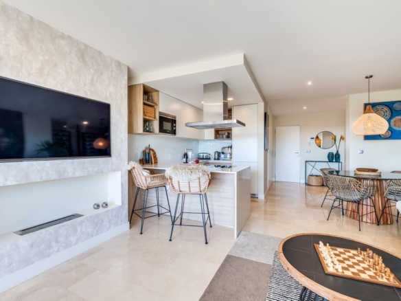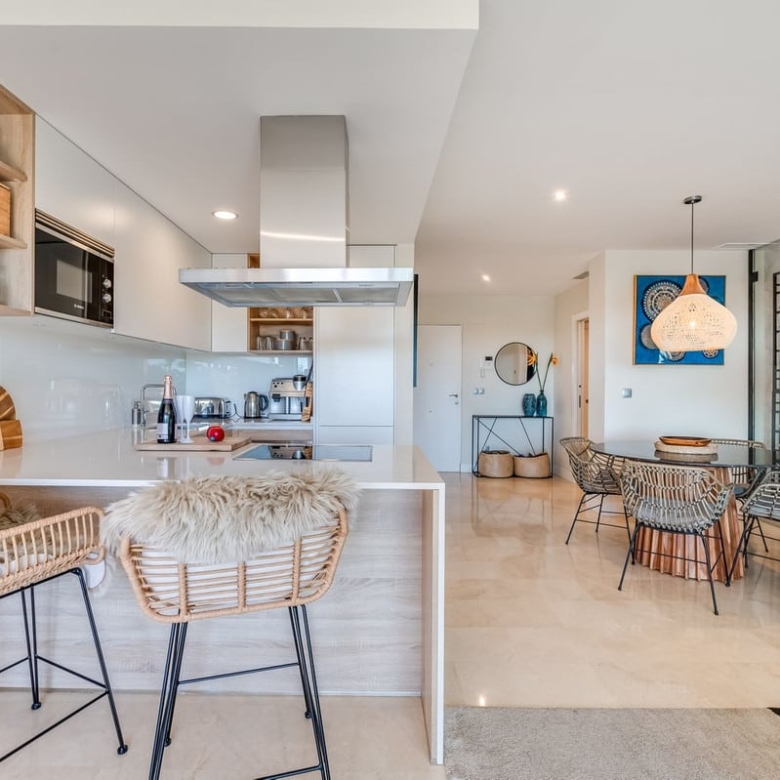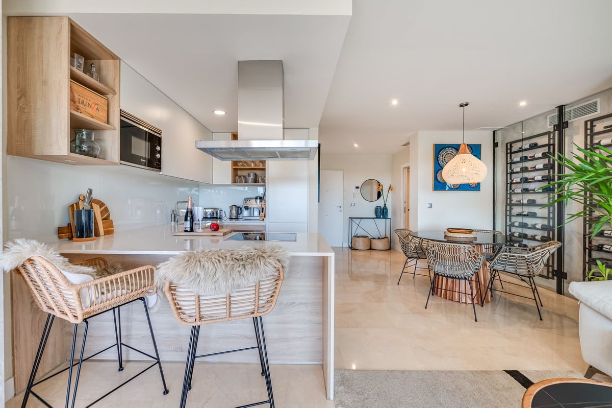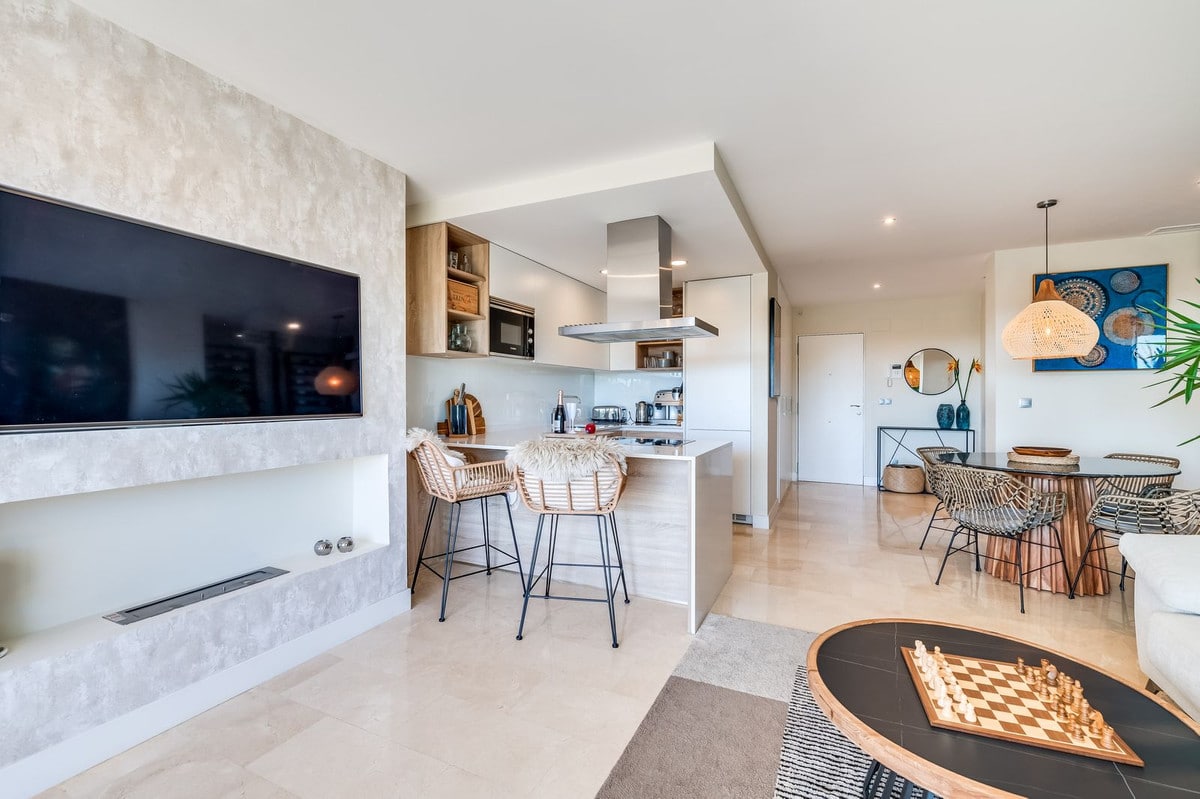 The apartment is filled with natural light and offers stunning views of the urbanization’s gardens, as well as the sea and mountains. Each room is fitted with large windows and air conditioning. The refurbishment has been completed using top-quality materials, and the decor has been thoughtfully designed.