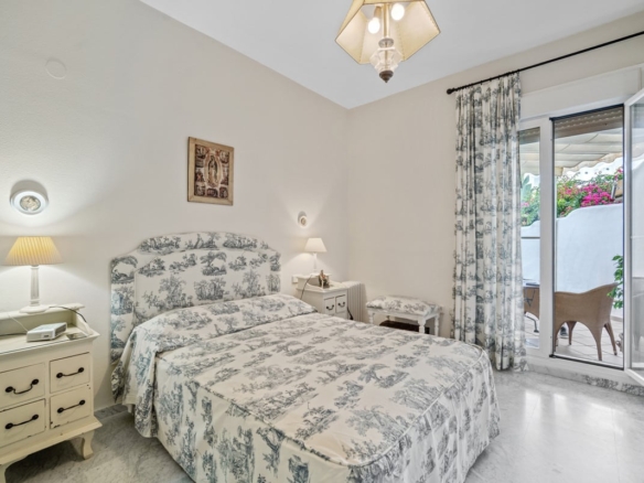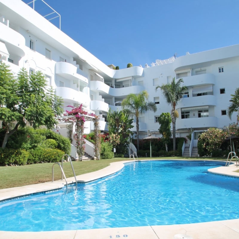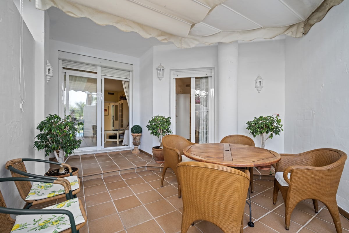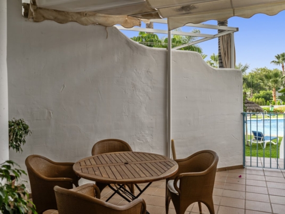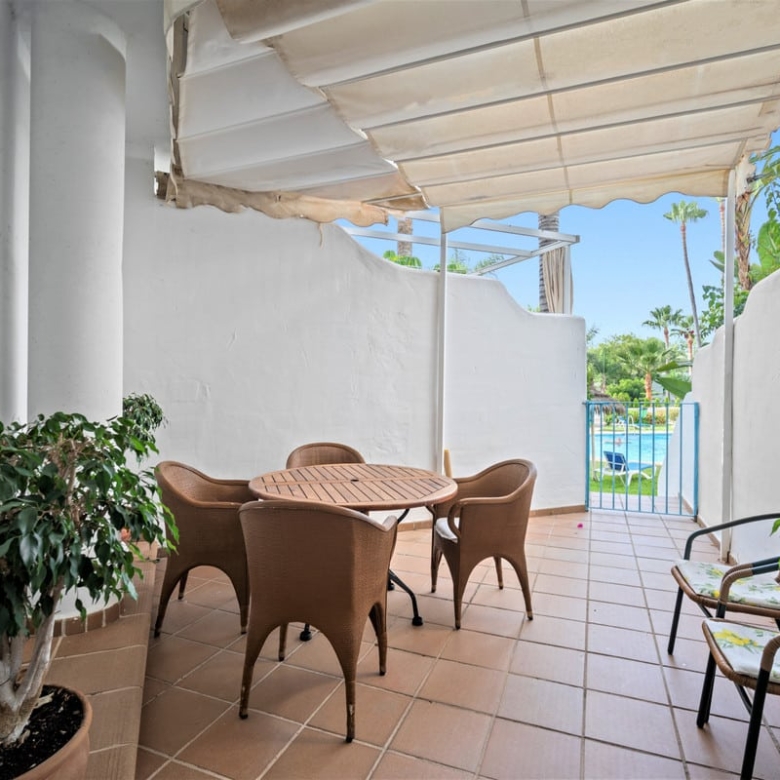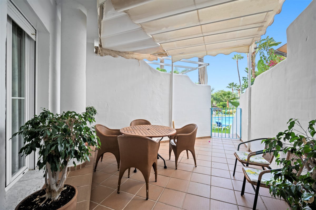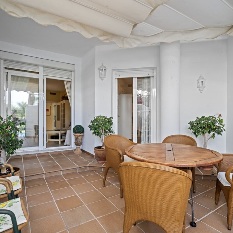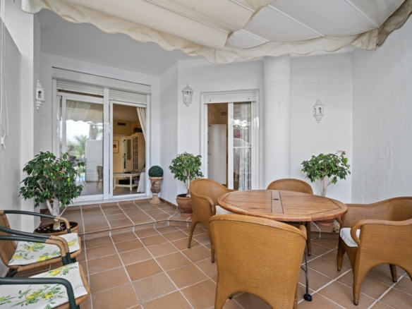 Spacious three bedroom, southwest facing ground floor apartment in the well-known and gated community Marbella Real. A prestigious gated community with well-kept tropical gardens, a children’s playground, five communal swimming pools, gymnasium, sauna, paddle courts and located a stone throw from the beach and local amenities. The property has an open living and dining area with access to a lovely terrace with direct access to the garden and swimming pool; a fully equipped kitchen with access to a large rear terrace which has the possibility to be enclosed; master bedroom with en suite bathroom and access to the terrace; two guest bedrooms; and a guest bathroom. Other features include fitted wardrobes, shutters on the windows, a parking space and a storeroom.