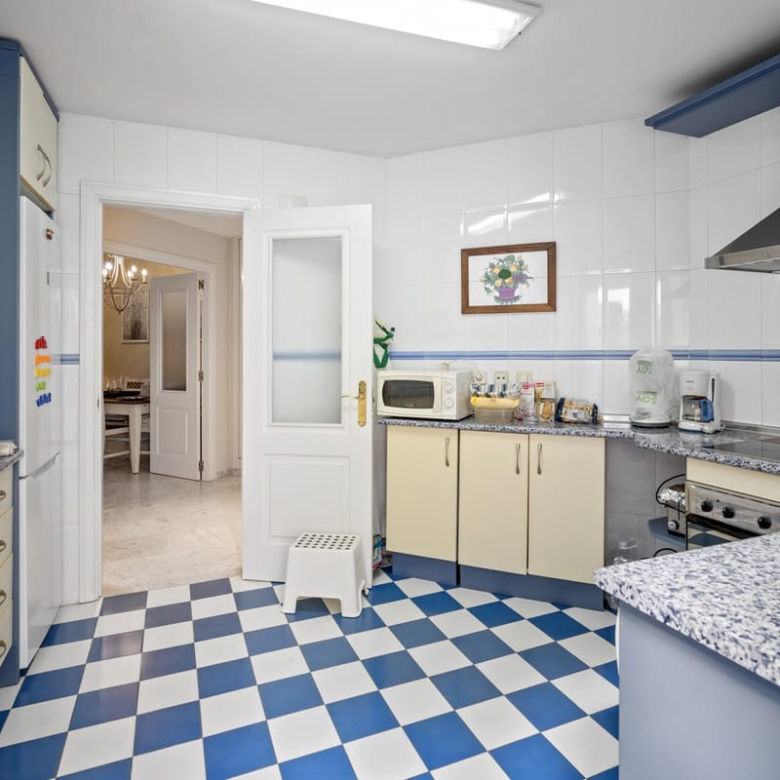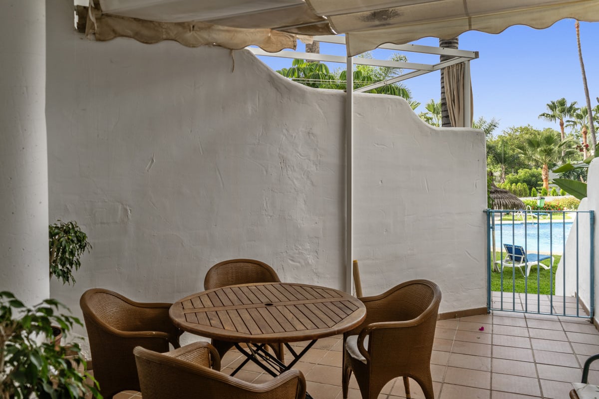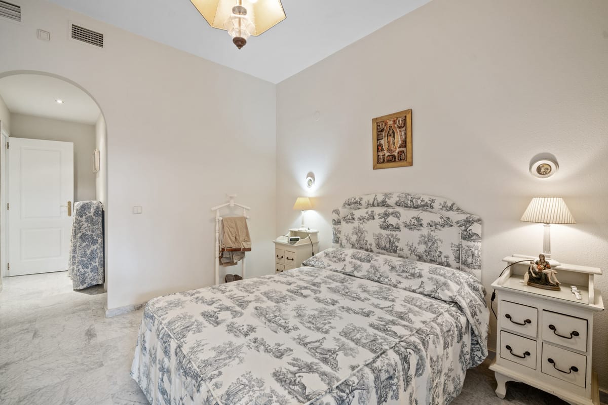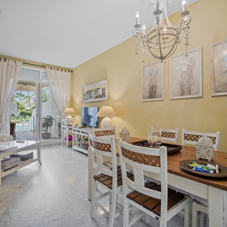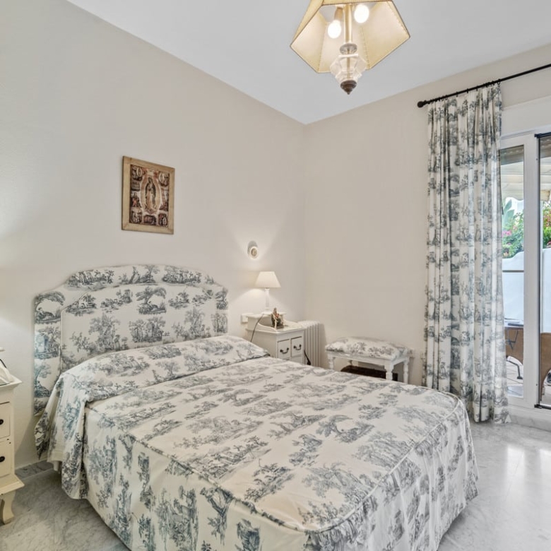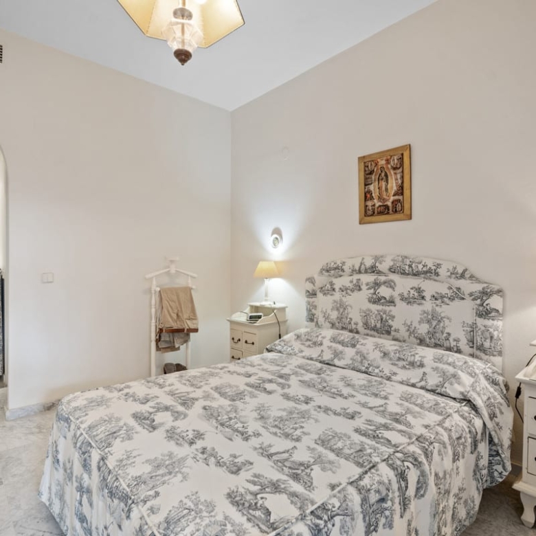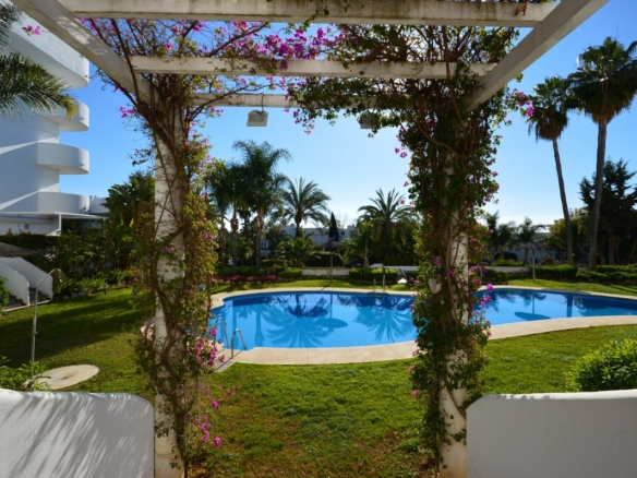 Spacious three bedroom, southwest facing ground floor apartment in the well-known and gated community Marbella Real. A prestigious gated community with well-kept tropical gardens, a children’s playground, five communal swimming pools, gymnasium, sauna, paddle courts and located a stone throw from the beach and local amenities. The property has an open living and dining area with access to a lovely terrace with direct access to the garden and swimming pool; a fully equipped kitchen with access to a large rear terrace which has the possibility to be enclosed; master bedroom with en suite bathroom and access to the terrace; two guest bedrooms; and a guest bathroom. Other features include fitted wardrobes, shutters on the windows, a parking space and a storeroom.