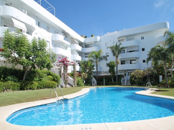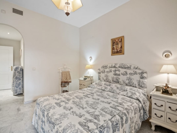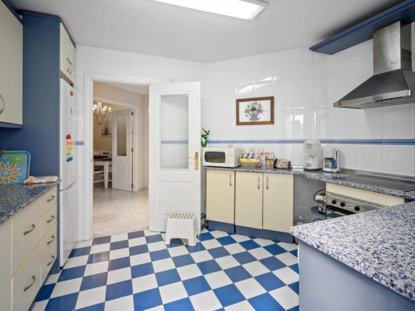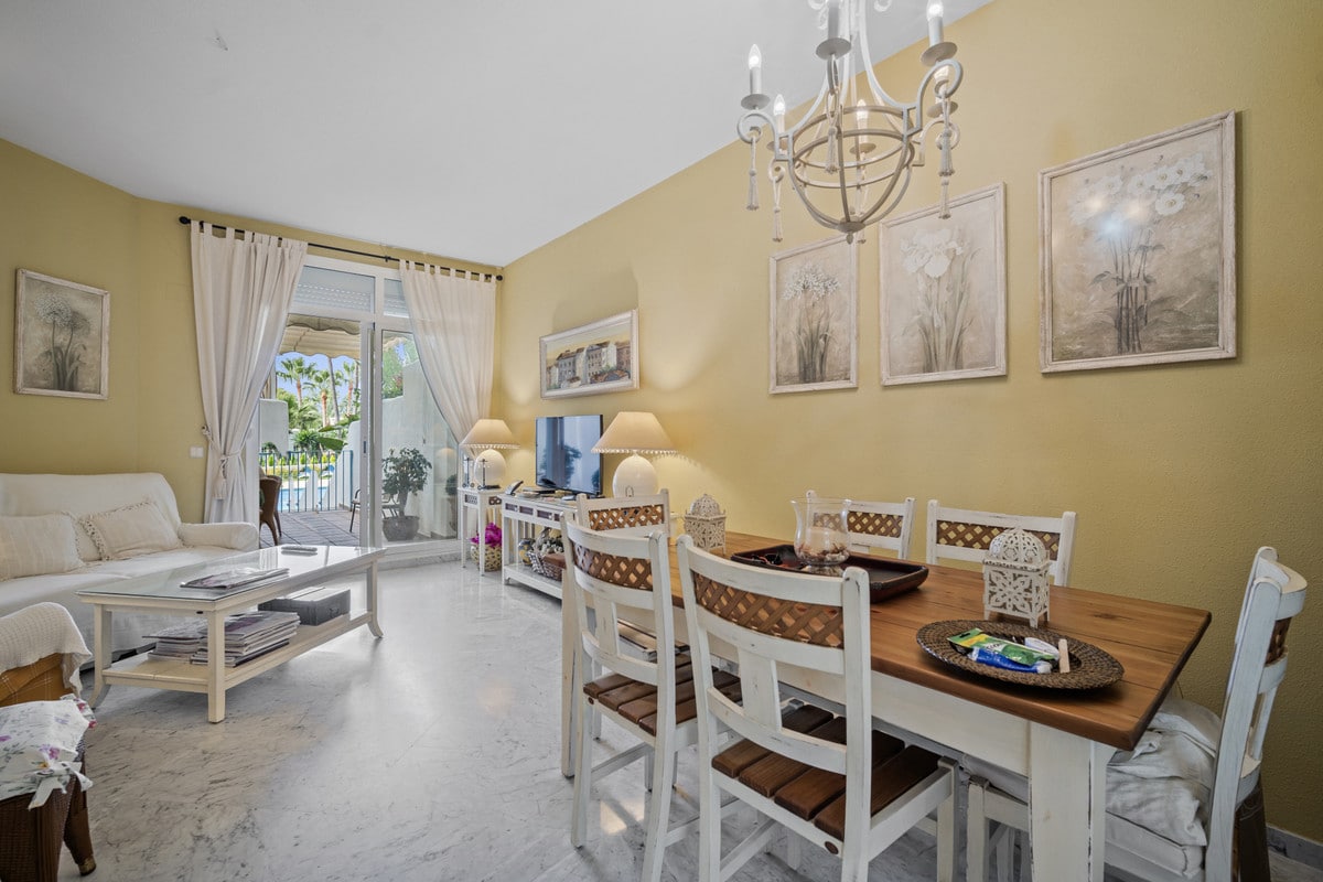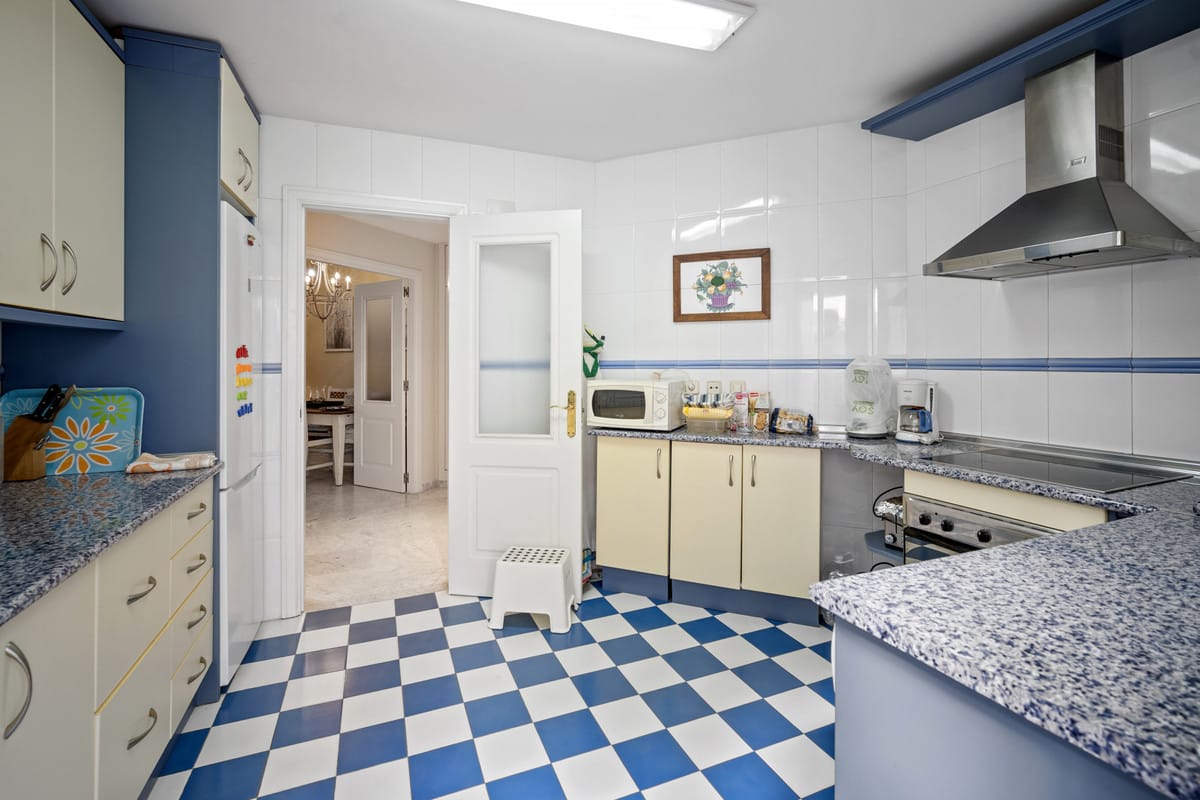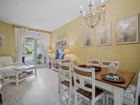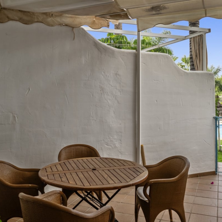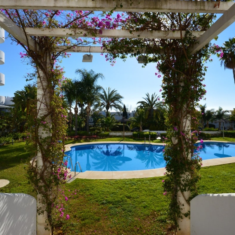 Spacious three bedroom, southwest facing ground floor apartment in the well-known and gated community Marbella Real. A prestigious gated community with well-kept tropical gardens, a children’s playground, five communal swimming pools, gymnasium, sauna, paddle courts and located a stone throw from the beach and local amenities. The property has an open living and dining area with access to a lovely terrace with direct access to the garden and swimming pool; a fully equipped kitchen with access to a large rear terrace which has the possibility to be enclosed; master bedroom with en suite bathroom and access to the terrace; two guest bedrooms; and a guest bathroom. Other features include fitted wardrobes, shutters on the windows, a parking space and a storeroom.