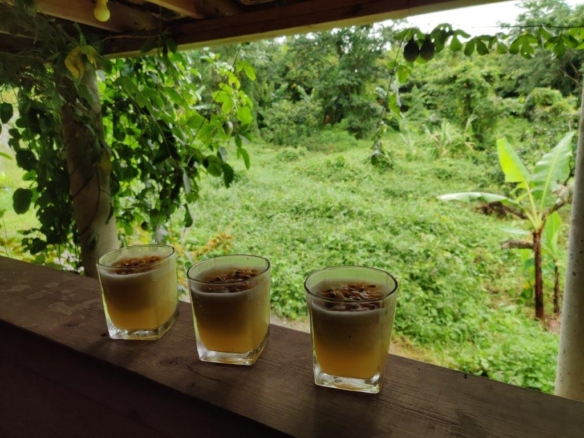 Large common area used as a restaurant build with imported hard wood from north Europe as well. This building is attached to a 40′ shipping container, repurposed for a bar and kitchen. Passion fruit vines throughout the restaurant.