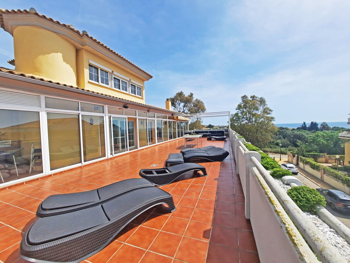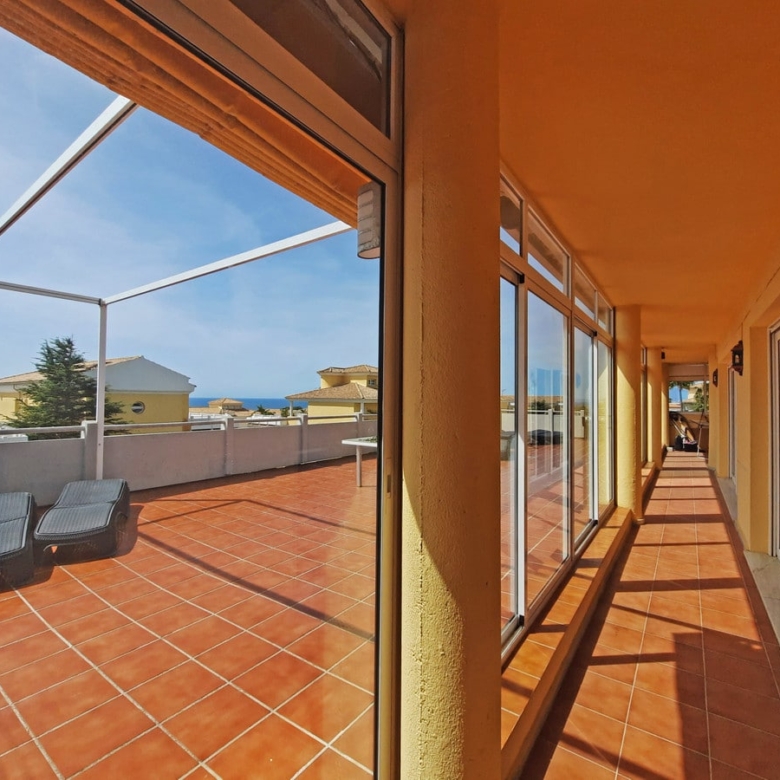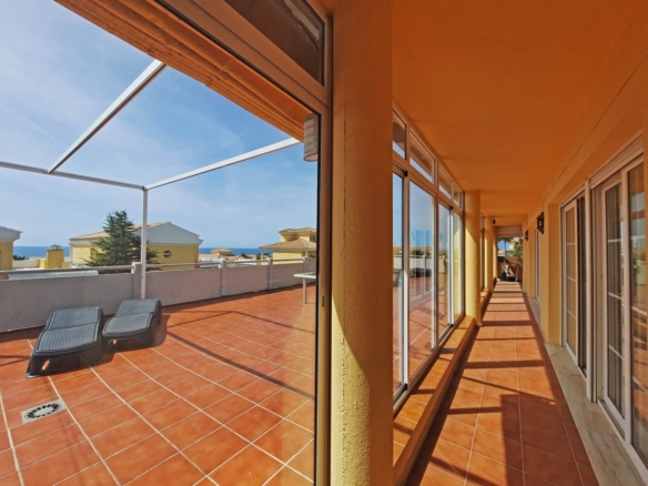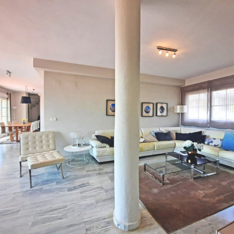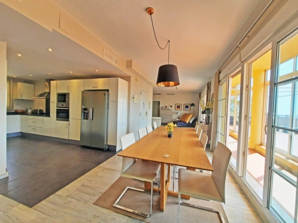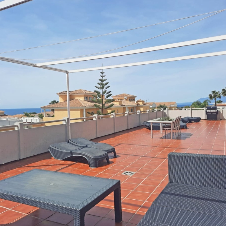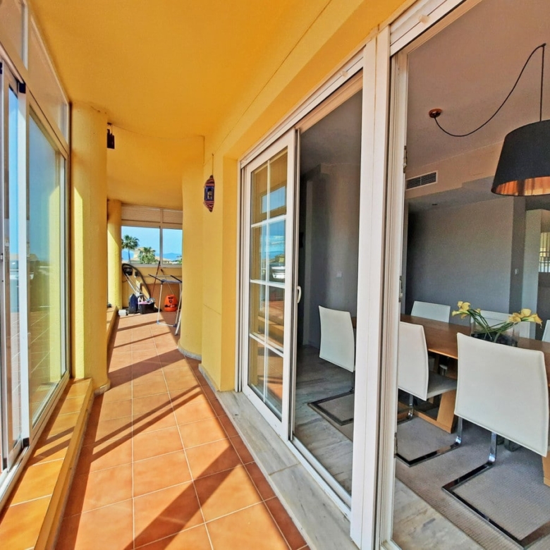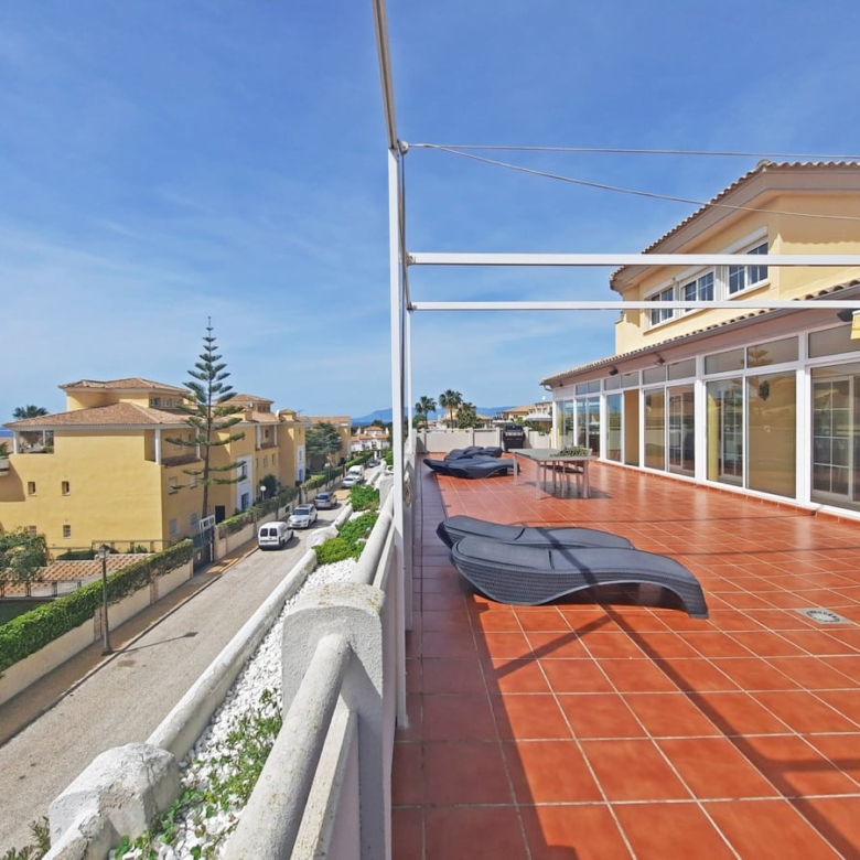This penthouse is one of those unique properties due to its size, with 4 bedrooms, 3 on the first level, one of them ensuite and the other 2 are sharing a bathroom and another ensuite upstairs.The living-dining room is a large open space with a fully fitted kitchen and you can enjoy a sea view from everywhere. The massive terrace is partly glazed but mainly open and it’s facing the south to enjoy a maximum of sun. The apartment is also overlooking the communal swimming pool on the side. it’s sold as seen and it would benefit of some TLC but the potential is amazing. There is a parking space underground and more easy parking outside around the Urbanization. You can walk to the beautiful sandy beach of Cabopino and its lovely harbor.