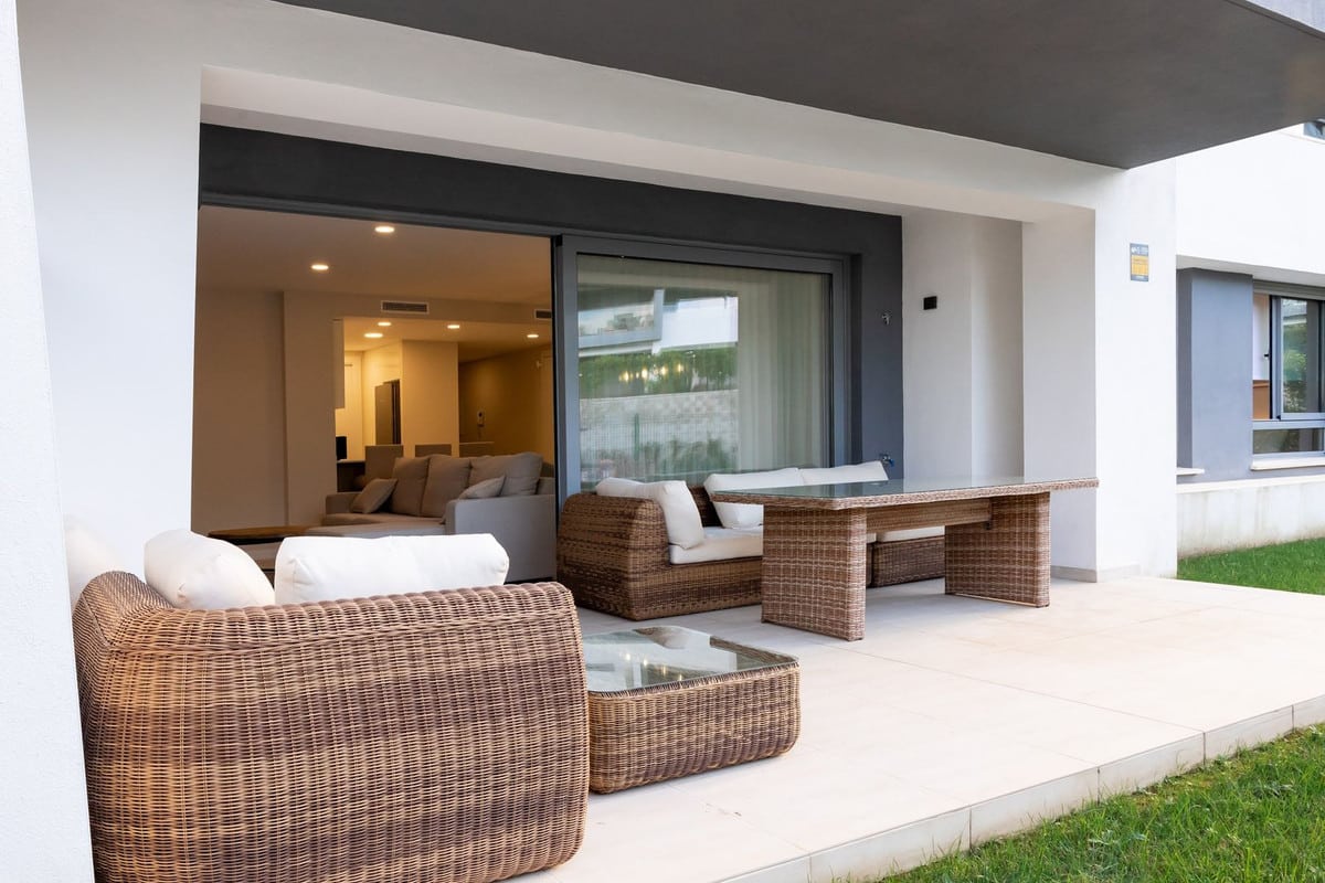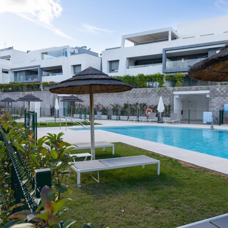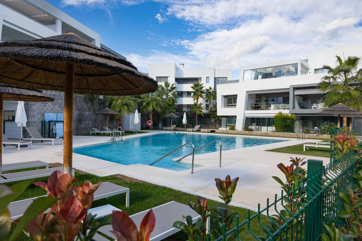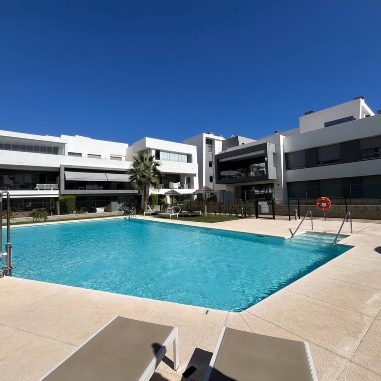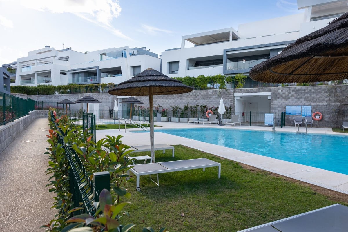 Modern apartments with four bedrooms, three bathrooms, a large garden, and a terrace in the Selwo residential area. The apartments are ideally located in a sought-after area between Marbella and Estepona, just 10 minutes by car from Puerto Banus and the center of Estepona. international school opposite the complex. Additionally, the beach can be reached in just a few minutes by car or a 10-minute walk.