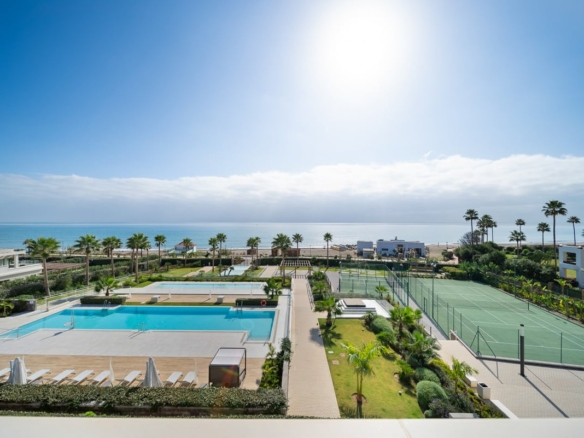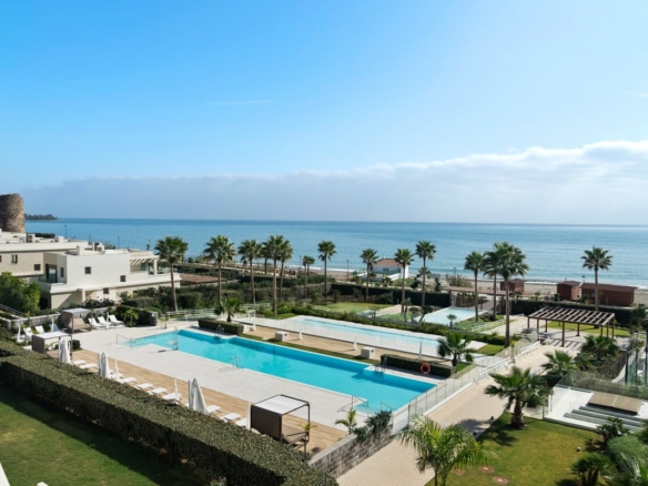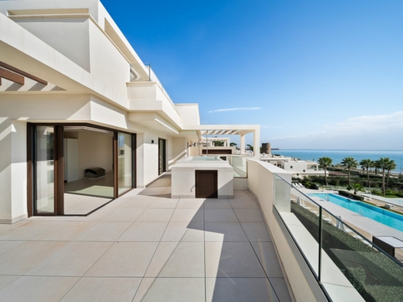 Welcome to a truly exceptional beachfront residence—a key-ready, luxury duplex penthouse in a prestigious, brand-new complex that defines coastal elegance. This expansive four-bedroom, four-bathroom penthouse is the only unit in the development that features a private, sparkling pool, creating a personal oasis with uninterrupted views of the Mediterranean. Every detail has been designed for sophistication and comfort: the open-plan kitchen seamlessly integrates with the spacious living area, all enhanced by floor-to-ceiling glass walls that capture panoramic, unobstructed sea views.
