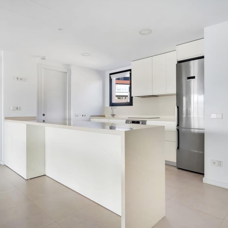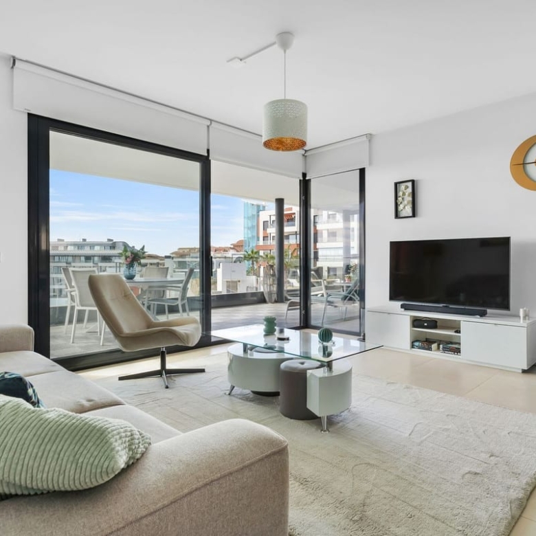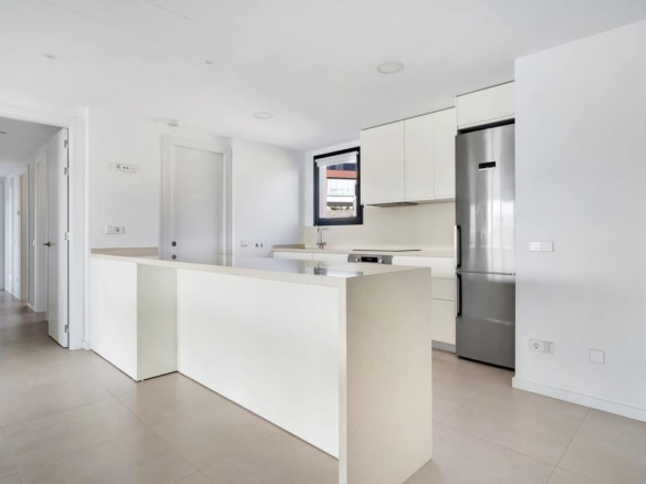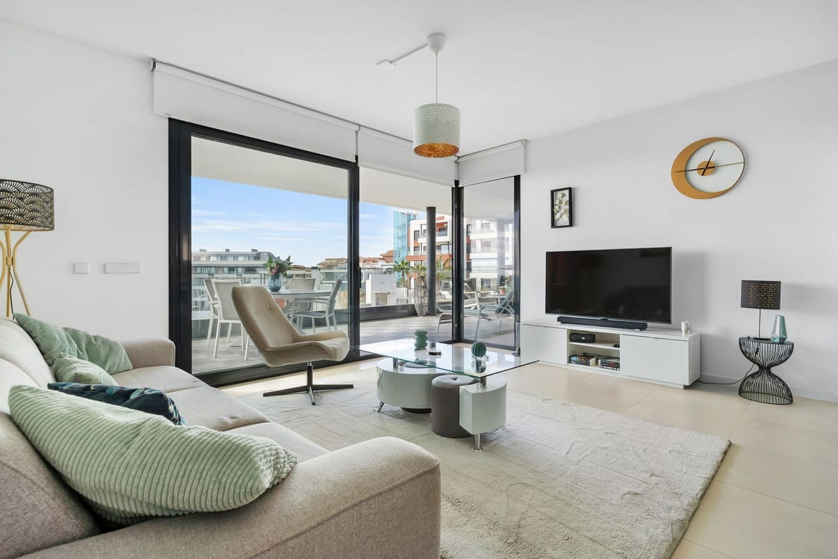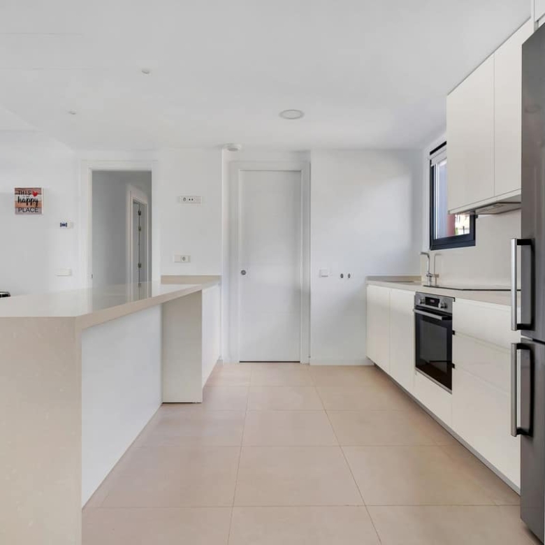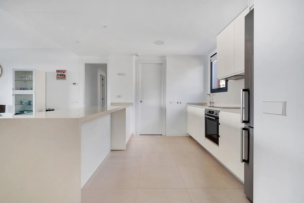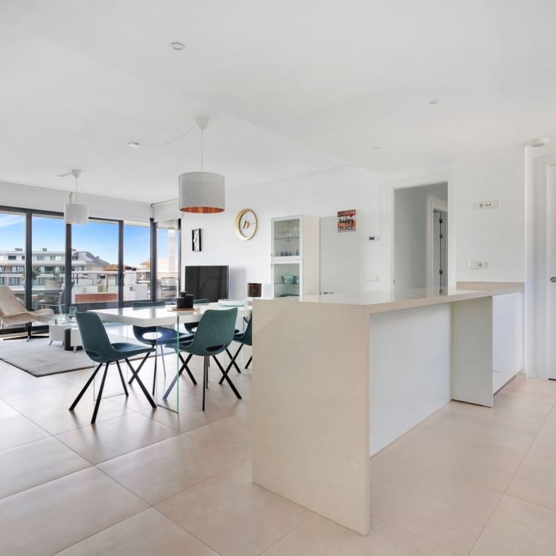 The bright living room leads to a large terrace of 40m2, where you can enjoy your morning coffee or a glass of wine at sunset, while looking out over the shimmering waves of the sea. The open kitchen, equipped with all comforts such as fridge, freezer, induction and oven, makes it perfect for daily meals or receiving guests.