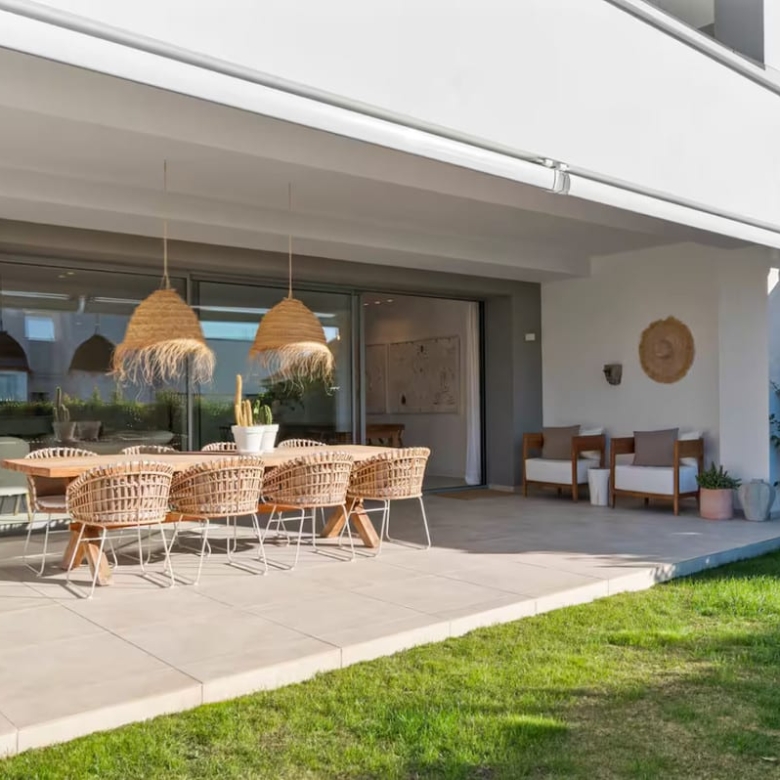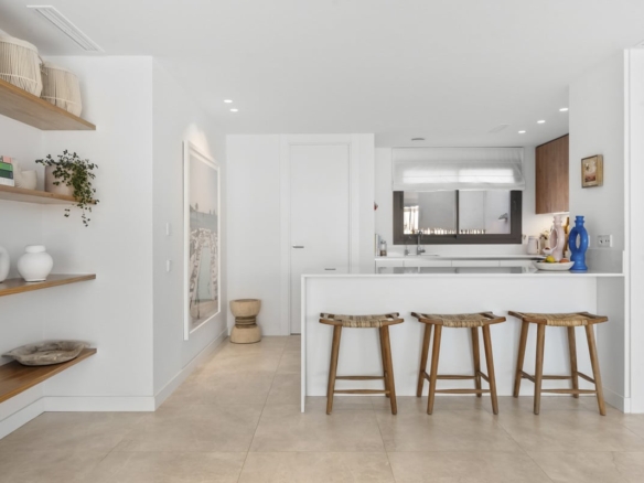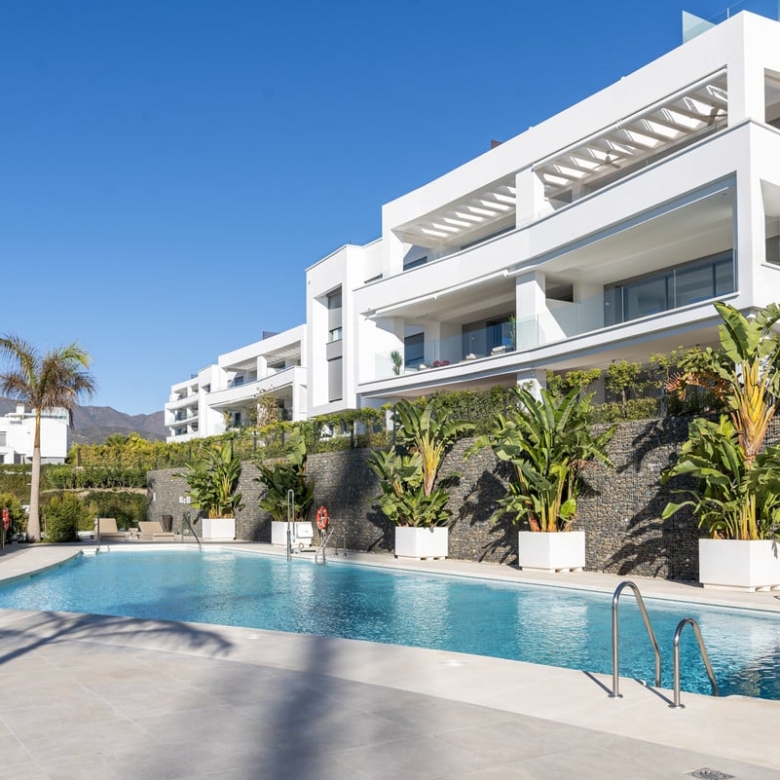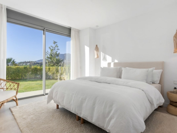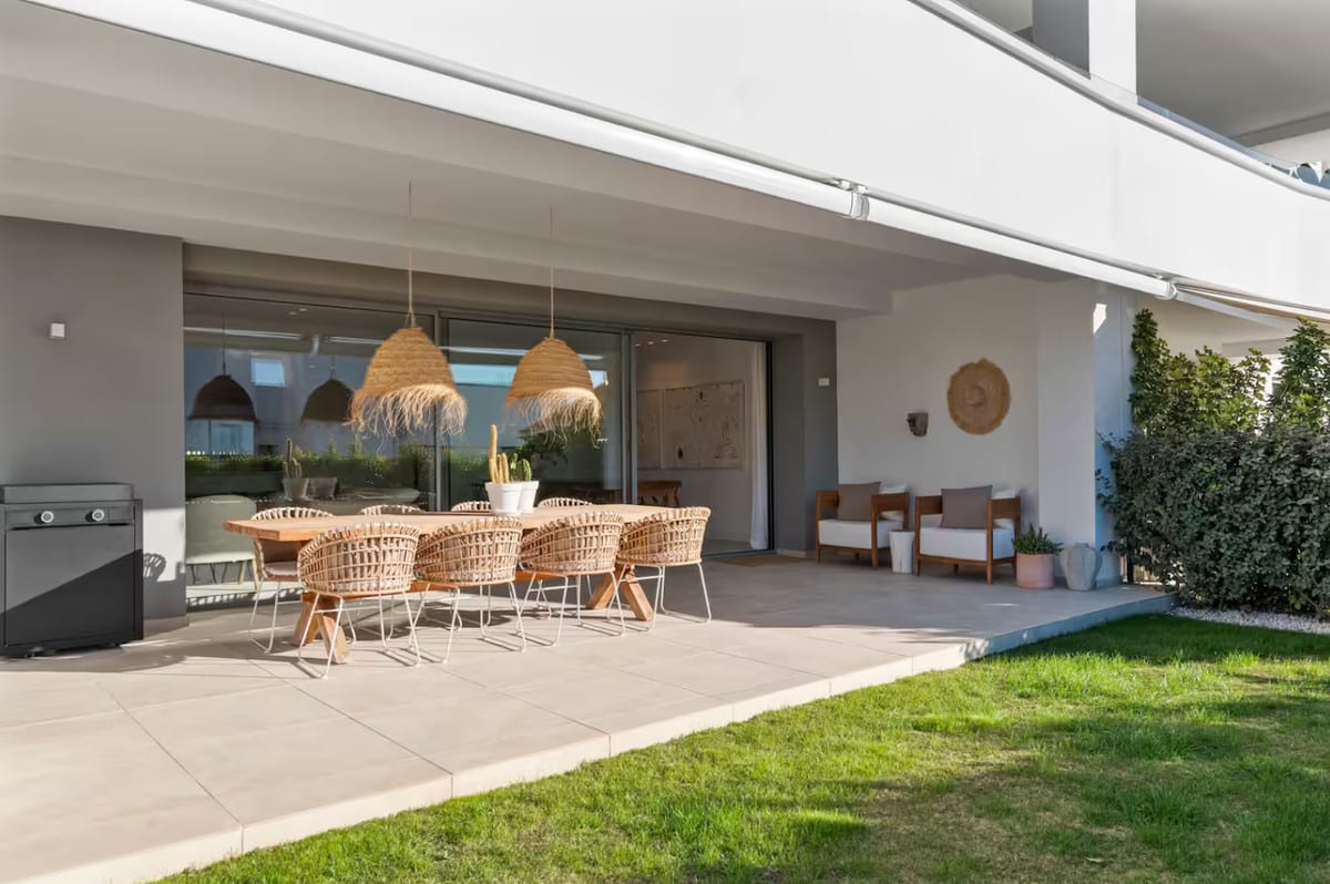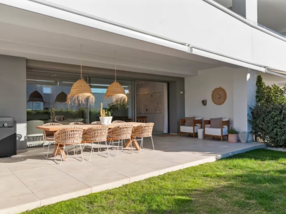 This ground-floor apartment features a spacious private garden and a terrace with partial sea and mountain views, offering the perfect setting to unwind or entertain. inside, a generously sized living room flows seamlessly into a sleek, open-plan kitchen with a separate utility room. Two expansive master bedrooms come with en-suite bathrooms, while the remaining two bedrooms share a stylishly appointed bathroom. All bedrooms feature built-in wardrobes, while air conditioning and underfloor heating ensure year-round comfort.