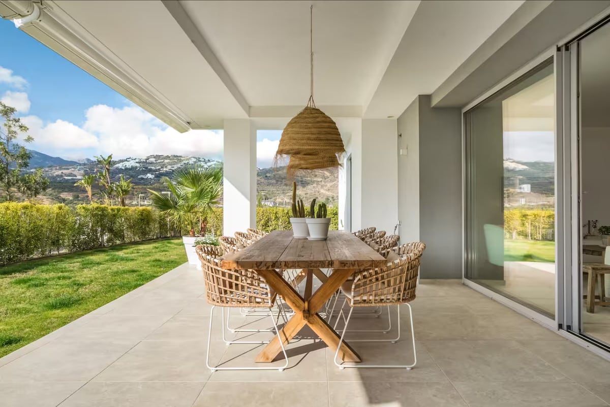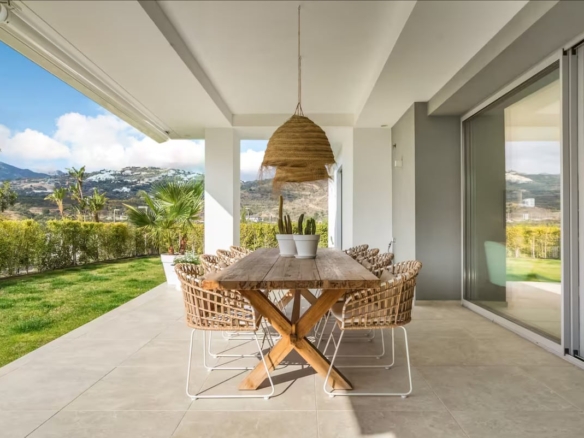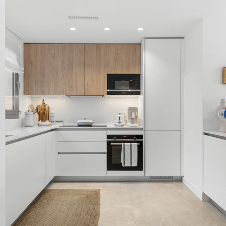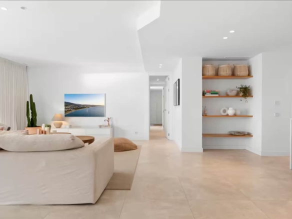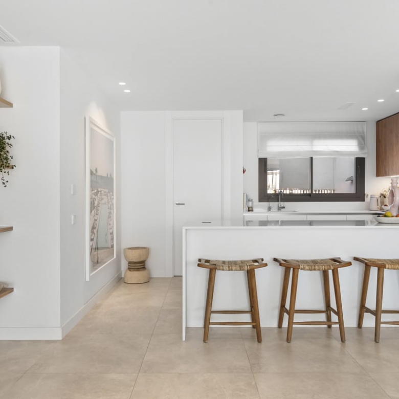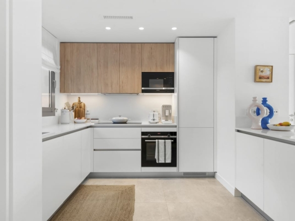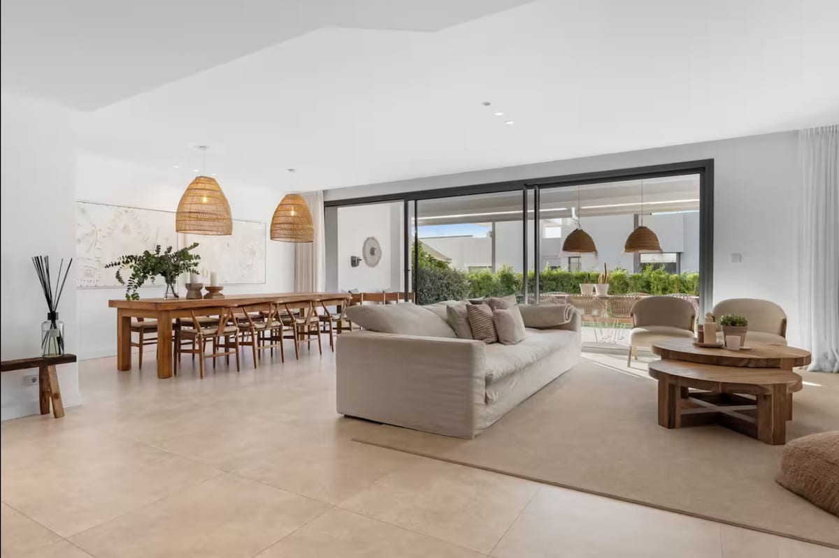 This ground-floor apartment features a spacious private garden and a terrace with partial sea and mountain views, offering the perfect setting to unwind or entertain. inside, a generously sized living room flows seamlessly into a sleek, open-plan kitchen with a separate utility room. Two expansive master bedrooms come with en-suite bathrooms, while the remaining two bedrooms share a stylishly appointed bathroom. All bedrooms feature built-in wardrobes, while air conditioning and underfloor heating ensure year-round comfort.