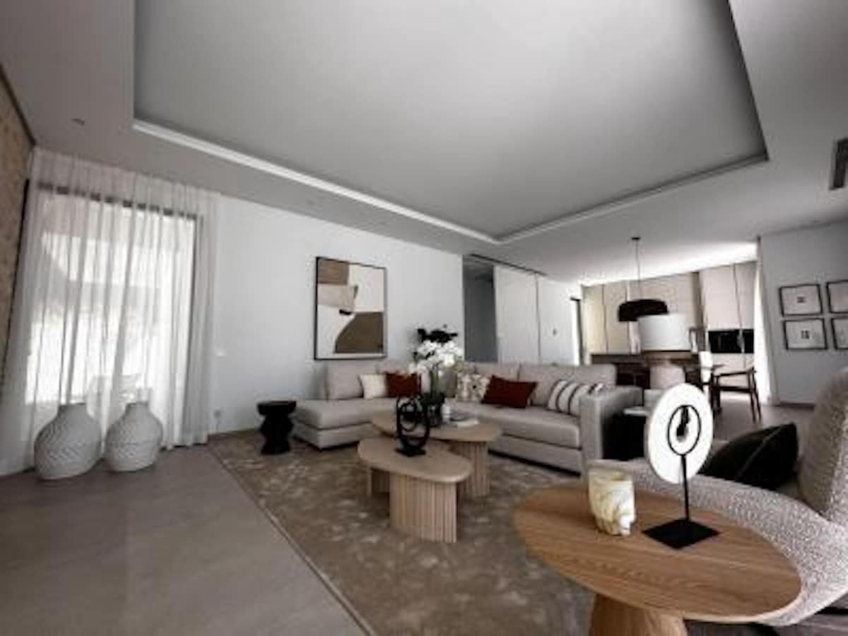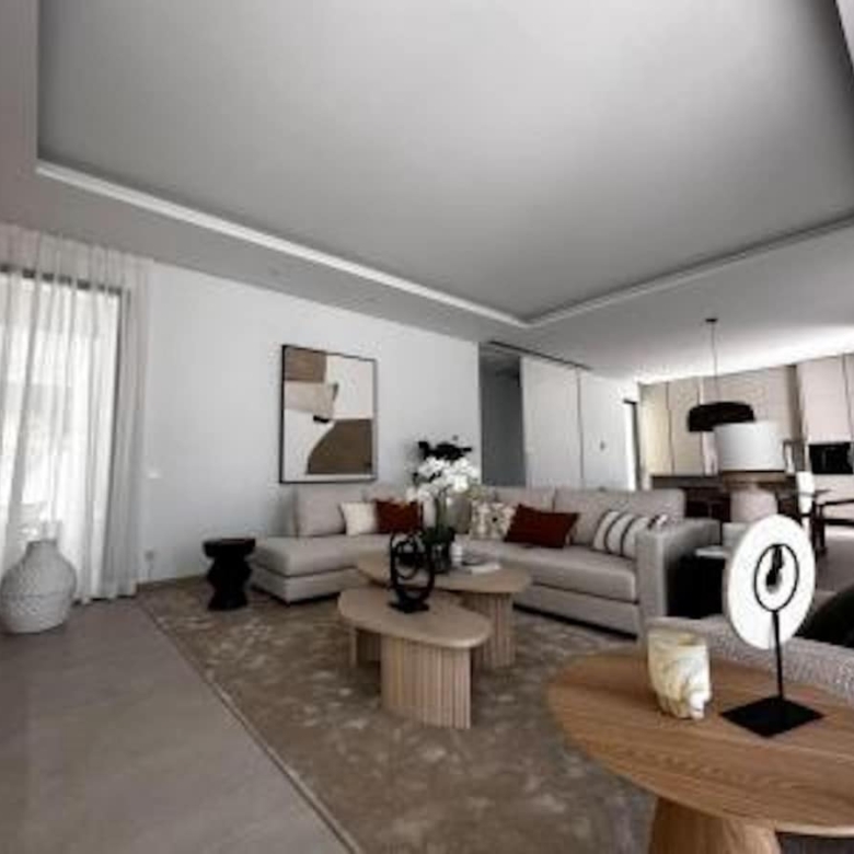 On the ground floor there is a living room with dining area, guest washroom, fully equipped kitchen with utility room, and 3 bedrooms with a bathroom in each, and fitted wardrobes. From the living room there is access to the terrace, where you can enjoy stunning views of the gardens, pools and the sea. All bathrooms have underfloor heating. On the top floor there is a master bedroom with en-suite bathroom, as well as a second terrace.