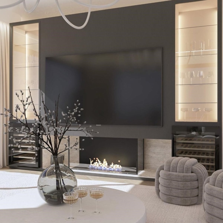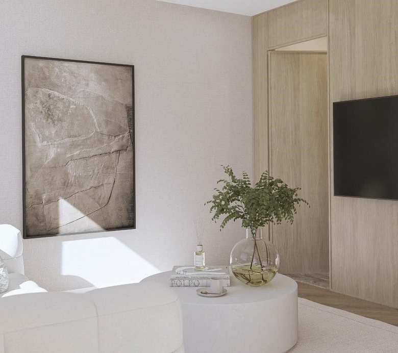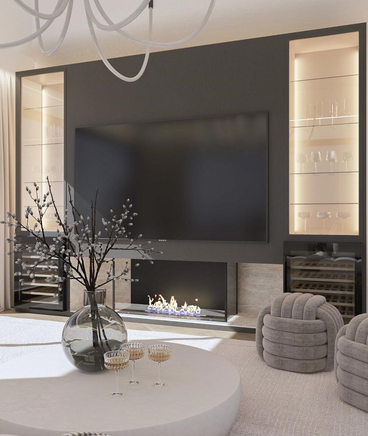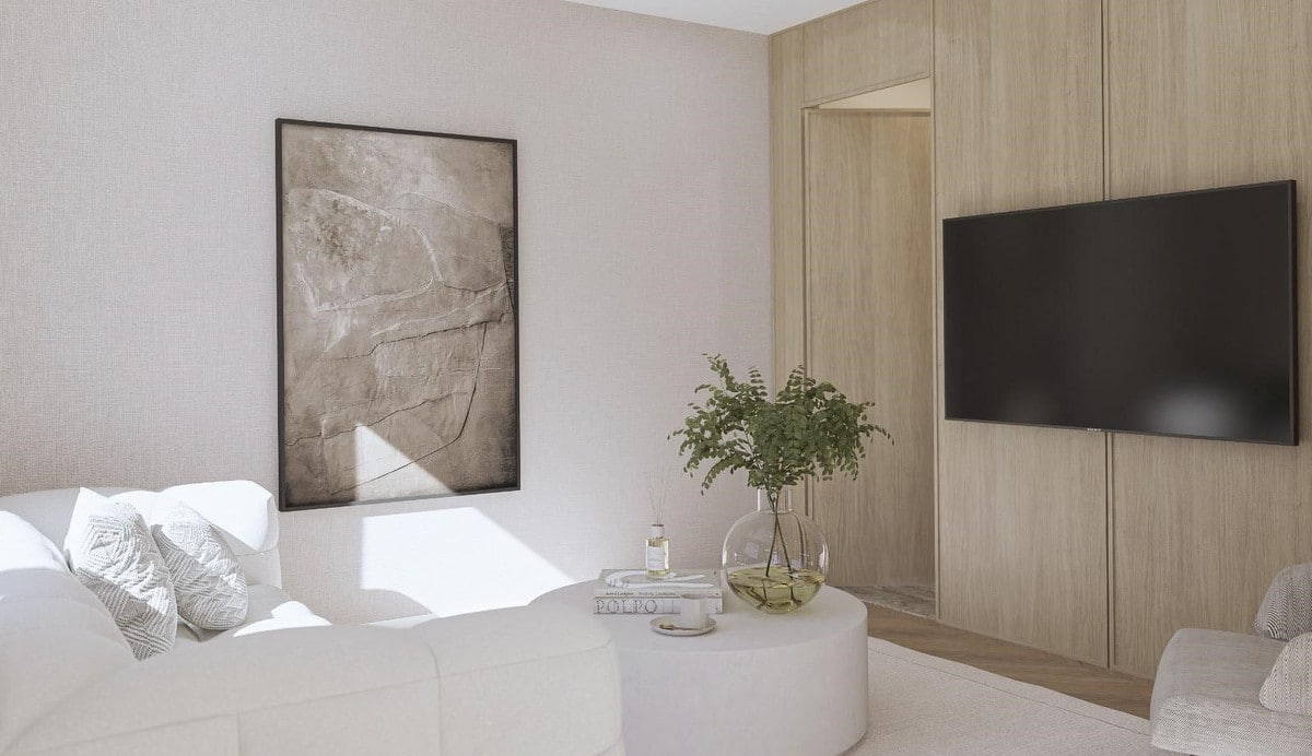 -A bright, open-concept living and dining area, complete with a sleek 70-inch integrated TV and wood finishes throughout.