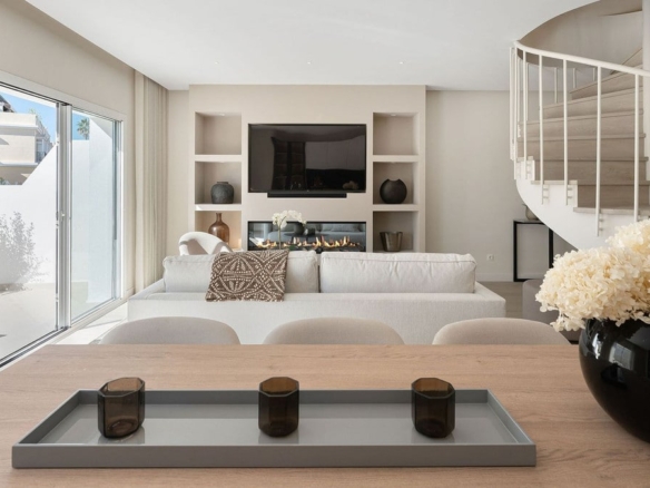 Welcome to this newly fully refurbished duplex penthouse in a popular urbanisation in Nueva Andalucia. As you enter you are greeted by the light and the soft colour scheme creating a feeling warmth and luxury. The open plan kitchen, living and dining room opens up to double doors onto the lower terrace which is perfect for that morning coffee. On this floor you also have the 4th bedroom and the combined bathroom and guest toilet. On the 2nd floor you have the large mastersuite with plenty of wardrobe space, large bathroom and a beautiful bay window looking towards Marbella and the sea. 2 guest rooms sharing a family bathroom completes this floor. The 3rd houses the solarium with beautiful sea and mountain views, a top of the line Jacuzzi and a storage room completes this space. The urbanisation has 3 pools, 24 hrs security and is situated close to the Aloha Strip with plenty of restaurants and services. Easy access to the penthouse from the underground parking space.