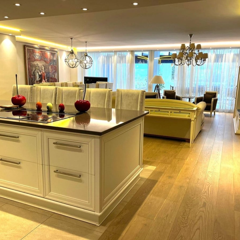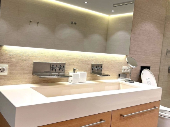 The apartment boasts a generous sunny terrace with stunning sea views. Upon entering, you are welcomed by a hallway that leads to the dining and living area, which opens onto the terrace. The fully integrated kitchen is seamlessly connected to the living space.