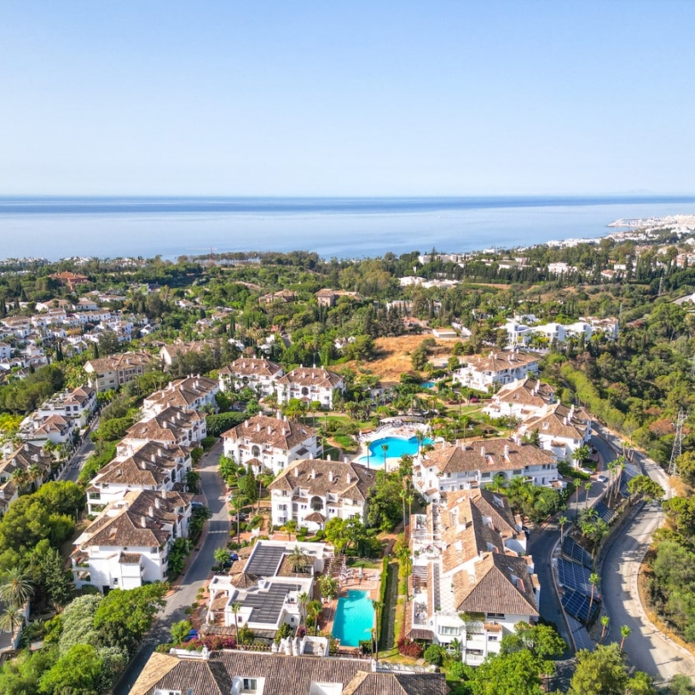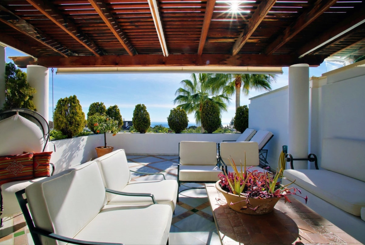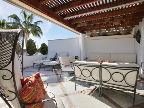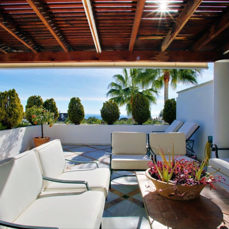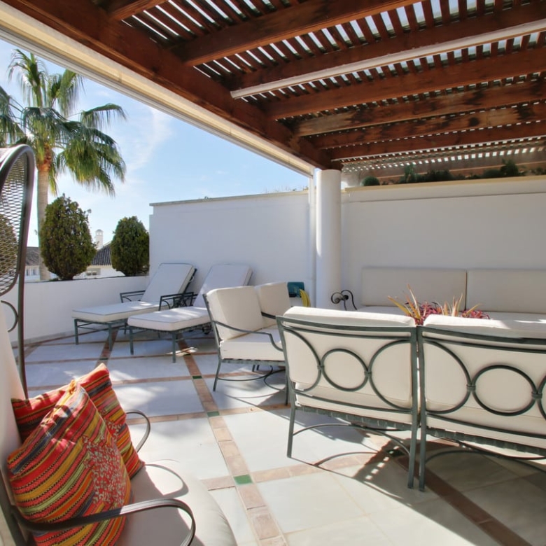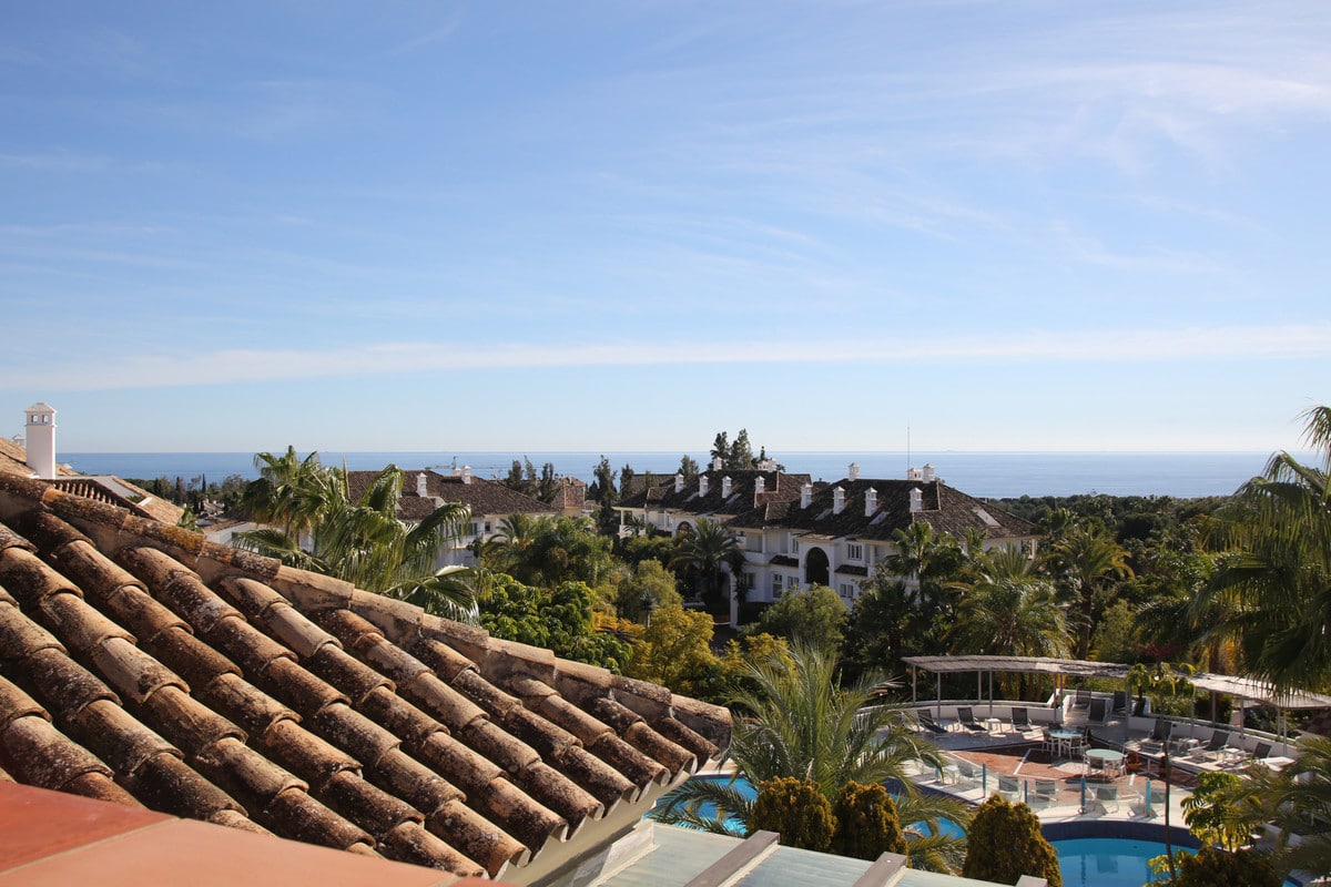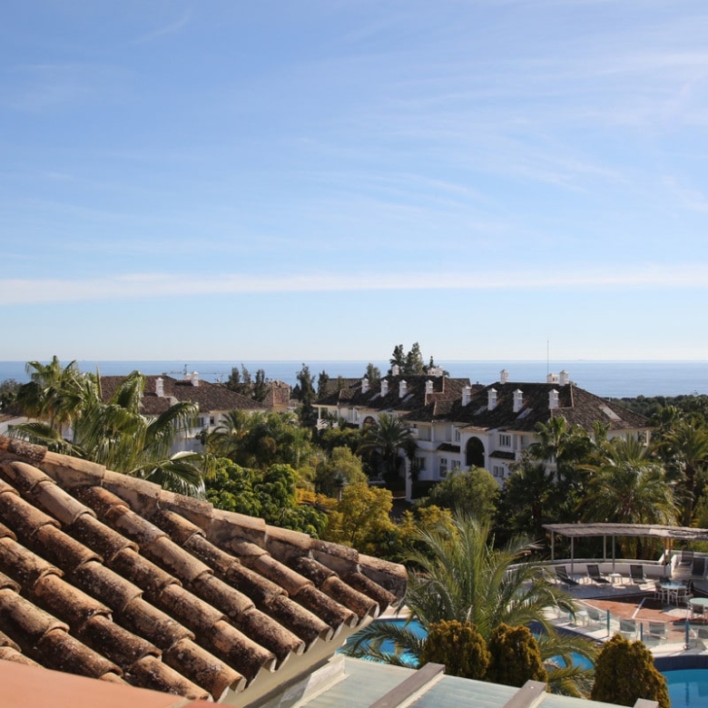 Exceptional four bedroom, south facing duplex penthouse in the exclusive and gated community of Monte Paraiso on the Golden Mile, with 24hr security, several outdoor swimming pools, a bar/restaurant, children’s play area, fully equipped gym, steam room, sauna, squash court, massage room, indoor heated swimming pool and tropical gardens that are maintained to the highest standards. As well as all this it is only a short walk to the famous Puente Romano Hotel and the beach. On the main level is an open plan living and dining area with fireplace and French doors leading out to the large terrace which has amazing panoramic sea views and views of the community; fully fitted kitchen with separate utility room and a small guest/staff suite accessed from the kitchen; two guest suites; and a guest toilet. On the top level is the master suite with vaulted ceilings, a Jacuzzi bath and an area which is currently being used as a salon but could also be used as a dressing room; there is also access from the bedroom to a private terrace which has amazing sea views. Other features include marble floors, hot and cold air conditioning, two parking spaces and a storeroom.