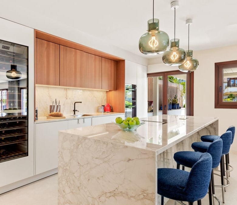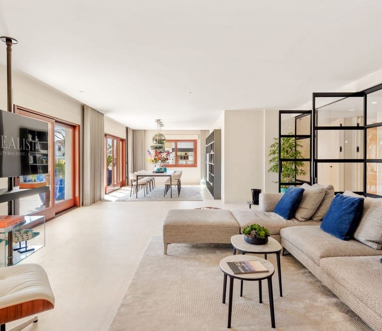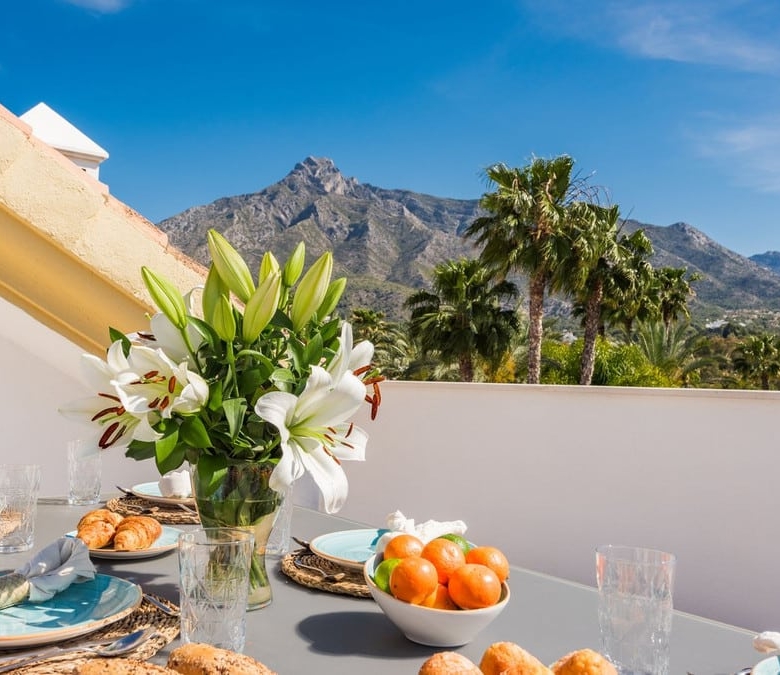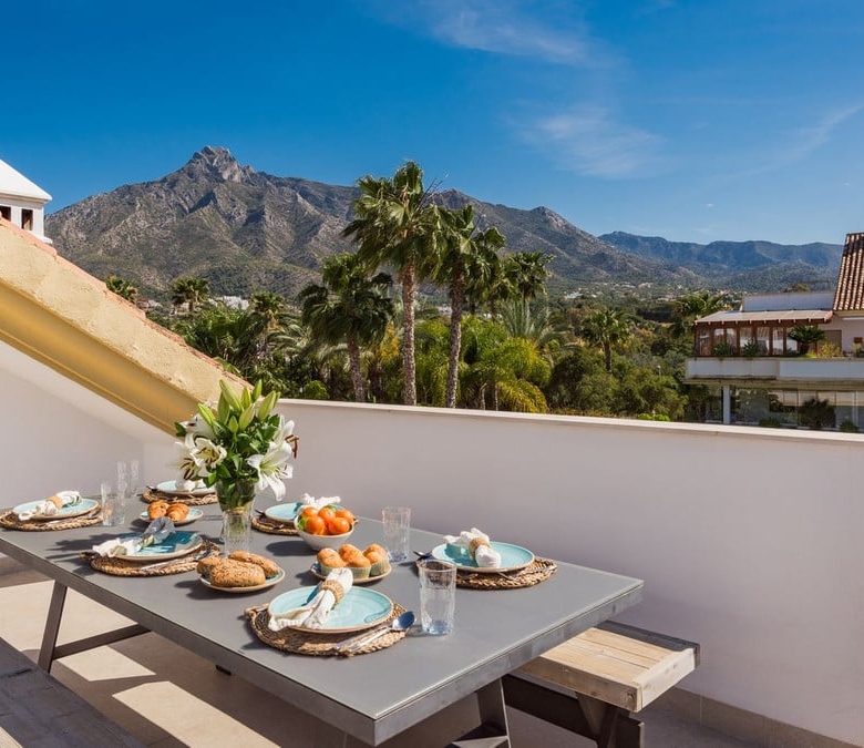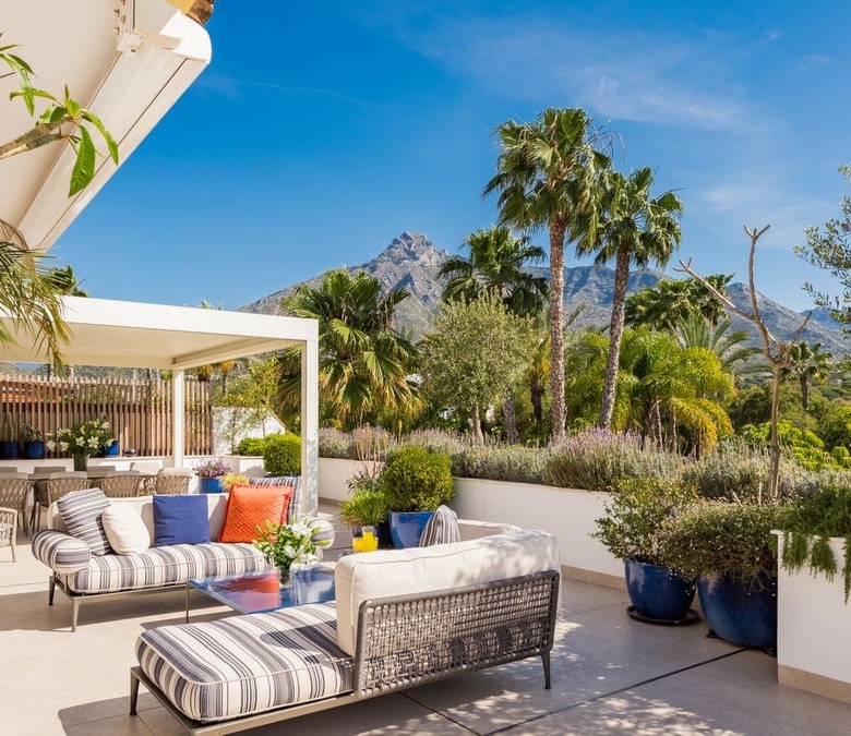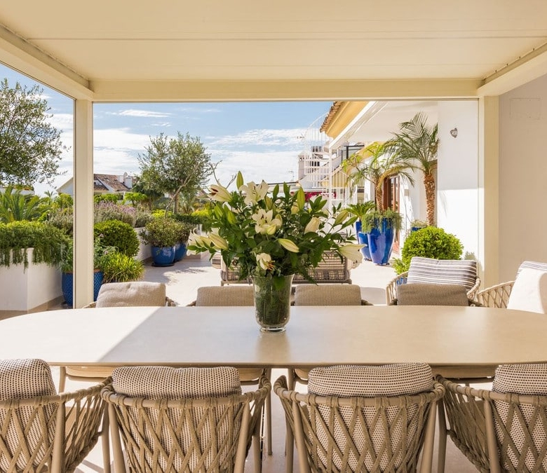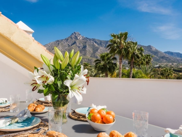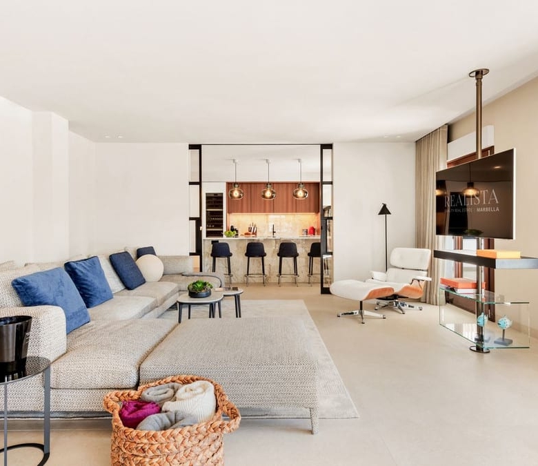 A spacious, fully refurbished 4-bedroom penthouse with a large entrance hall leading to the open plan living area. The modern designer fully fitted kitchen by SiEMATiC with the latest Miele appliances and breakfast island offers an inviting space for informal gatherings with family and friends. The combined open kitchen, dining room and living room are perfectly distributed all leading onto the grand terrace where different ambiences have been created, either enjoy the beautiful Mediterranean sunshine with an amazing back drop of the ‘La Concha’ mountain or relish in a more refreshing area under the automized pergola.