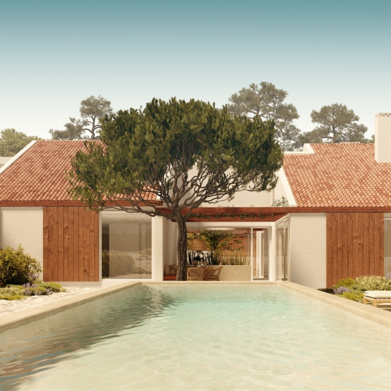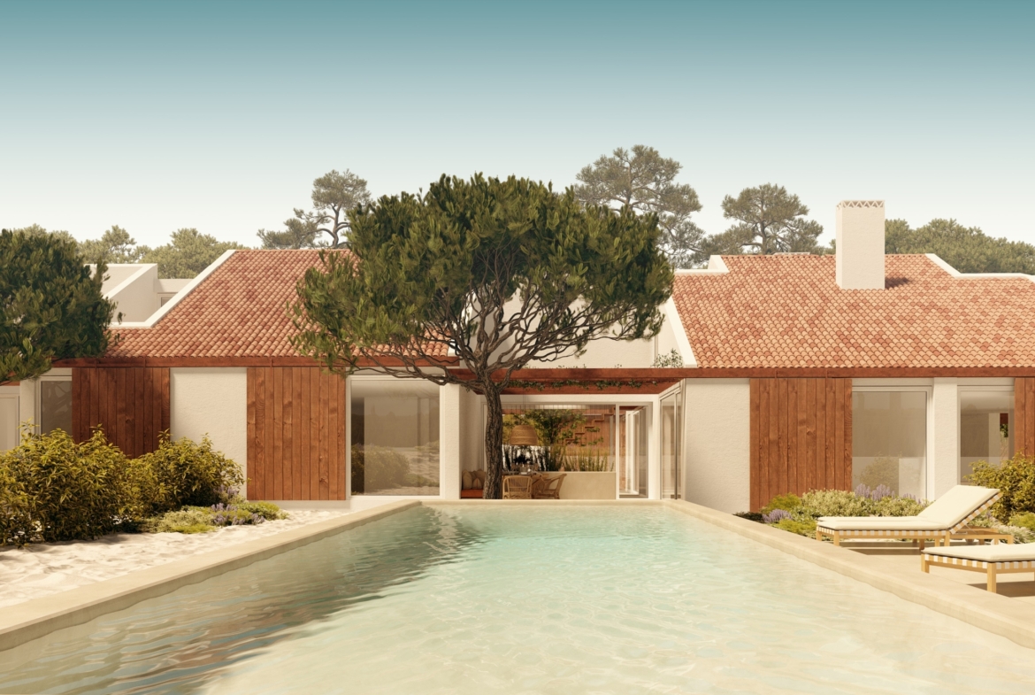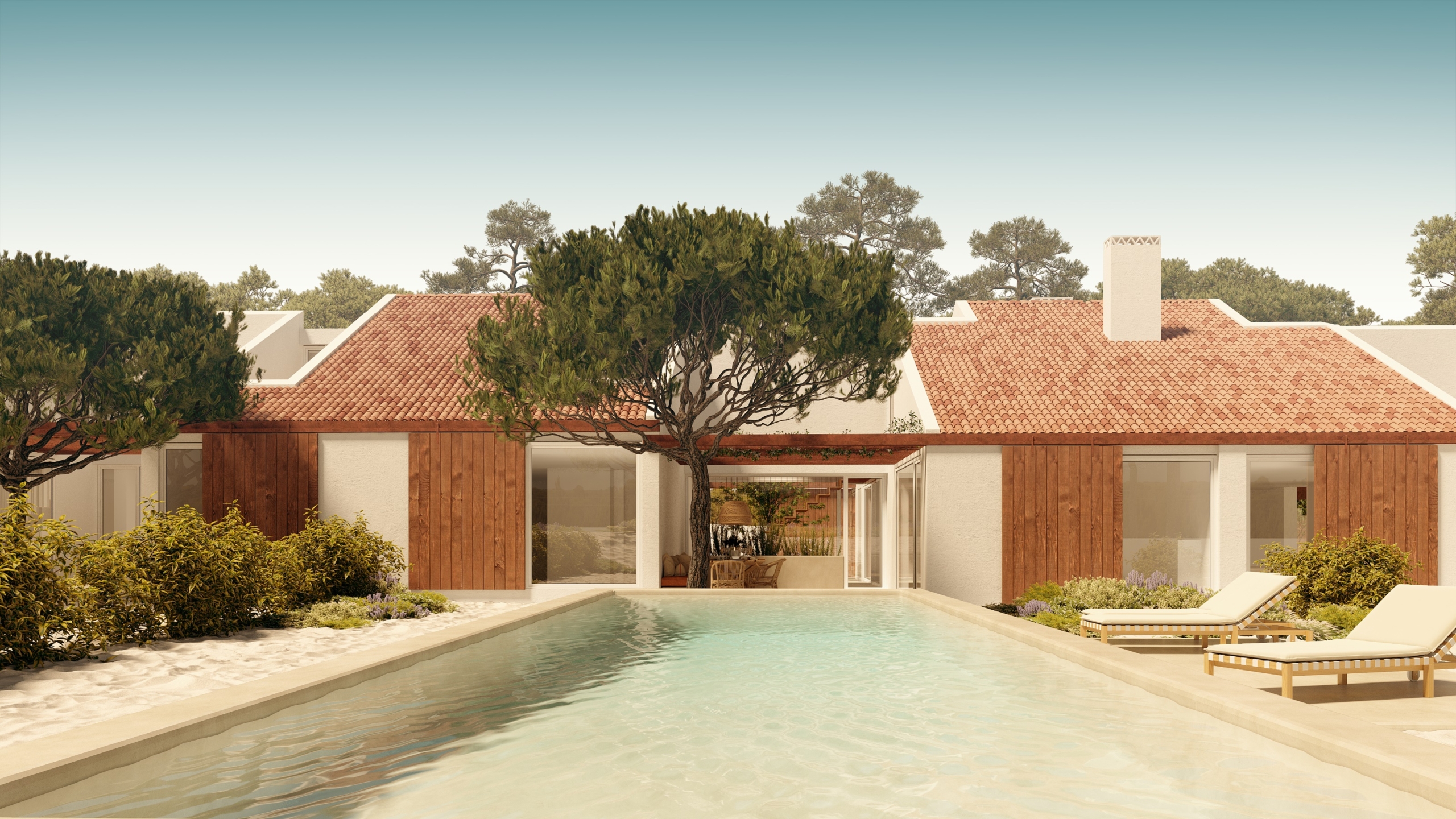4-bedroom villa, 209 sqm (construction gross area), set in a plot of land with 525 sqm, with terrace, garden and private swimming pool in Muda village, Comporta. The villa is spread over two floors. The ground floor consists of a kitchen, a guest bathroom, a master suite and a suite, both with a closet and an outdoor patio, a living room with access to the terrace and the swimming pool, a dining room and a storage room. The upper floor comprises two suites, with access to the terrace. It features an architectural style in harmony with the traditional style of the Comporta region. Sold turnkey, with delivery scheduled for the end of 2024.It is located in Aldeia da Muda, 10-minutes driving distance from the Carvalhal and Pego beaches, 15-minutes from Tróia Golf and the Tróia Marina, as well as from the famous village of Melides. 1 hour from Lisbon.