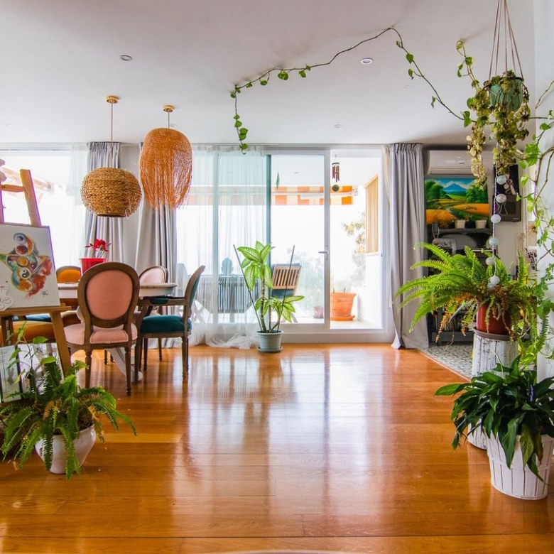 Beautiful living room with kitchen in open space.