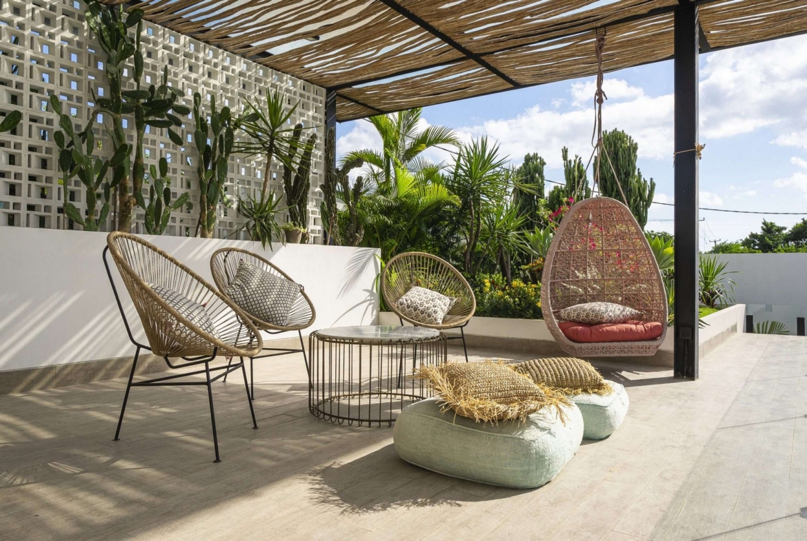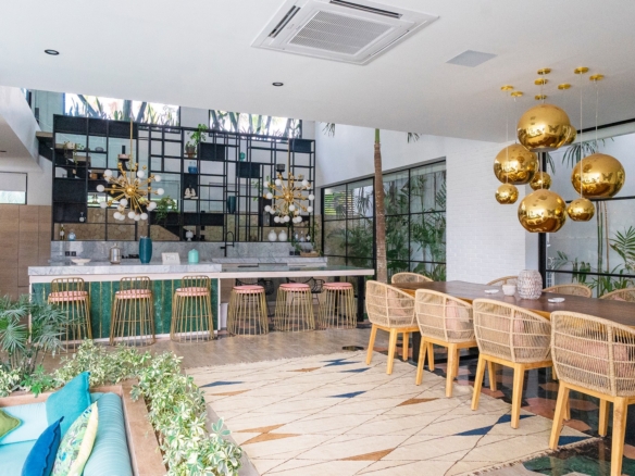 The decor’s cool tones create a soothing counterpoint to the sunny outdoor spaces—socialize, enjoy a film, or practice yoga in the many comfortably-appointed spaces. There is ample area for staging dance performances and other cultural productions. This lush and private paradise is conveniently located near artisan shops and top-rated restaurants, beach clubs, spas, gyms, and cafes.
