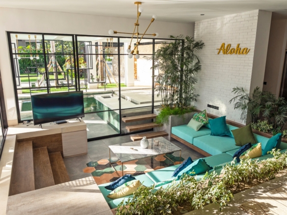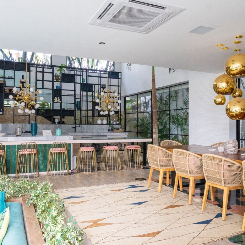Imagine lounging at the pool bar, partaking of exotic fruits, enjoying a barbecue prepared on the open grill, whilst relishing the breathtaking sunsets from the terrace. The Villa was designed with artful sophistication by renowned Spanish architect Felipe González. It emanates an air of modern elegance with its open layout, high-beamed ceilings, dramatic waterfall, fully equipped western kitchen, Italian tile, smart TV, and an integrated Bluetooth sound system. Perfect for families, friends, parties and weddings, the villa was created for both retreating into your personal space, as well as for gatherings to inspire treasured memories.
