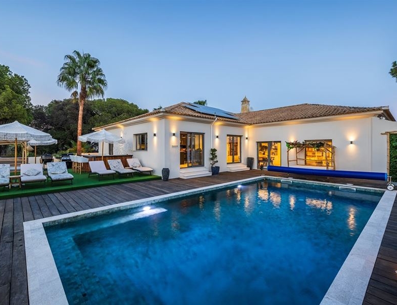 This six bedroom villa for sale is nestled in a tranquil area of Almancil, within a short distance from the city centre and a wide array of golden beaches. With meticulously designed features, this property is the epitome of elegance and modern comfort.Upon entrance, you’ll be greeted by an inviting entry hall that leads to a spacious living room, a sophisticated dining area, and a fully fitted kitchen equipped with AEG appliances. With six generously proportioned bedrooms and modern bathrooms, this villa offers luxurious living spaces tailored for utmost comfort. Additionally, indulge in entertainment within the games room, complete with a pool table, a bar and lounge area, ideal for hosting gatherings with friends and family.Externally, the villa offers expansive terraces, a covered area featuring a dining and lounge space, a designated BBQ area, a large heated saltwater pool, and beautifully landscaped gardens.Additional features include:air conditioning, solar photovoltaic panels, electric fireplace, teak wood flooring, heated towel rails, private parking and more.Boasting a prime location just five minutes away from the prestigious areas of Vale do Lobo and Quinta do Lago, this villa enjoys easy access to pristine beaches, world-class golf courses, and a wide range of luxury amenities. Families seeking top-tier education for their children will appreciate the proximity to the renowned Nobel International School, enhancing the villa’s appeal as the ideal choice. Faro International Airport is only a 30 minute drive away from the property.