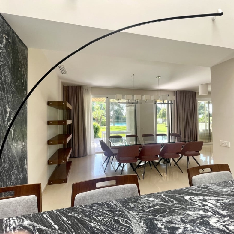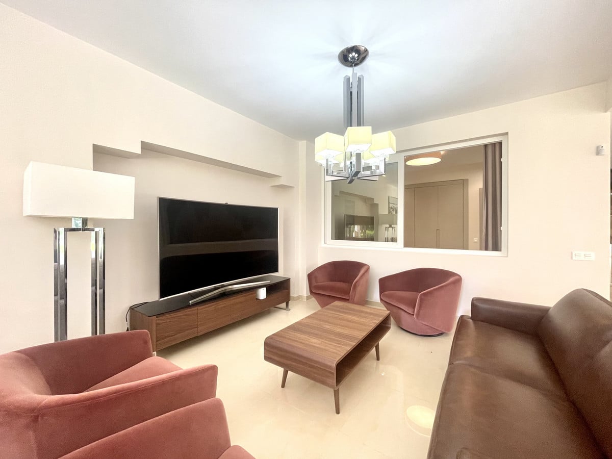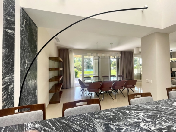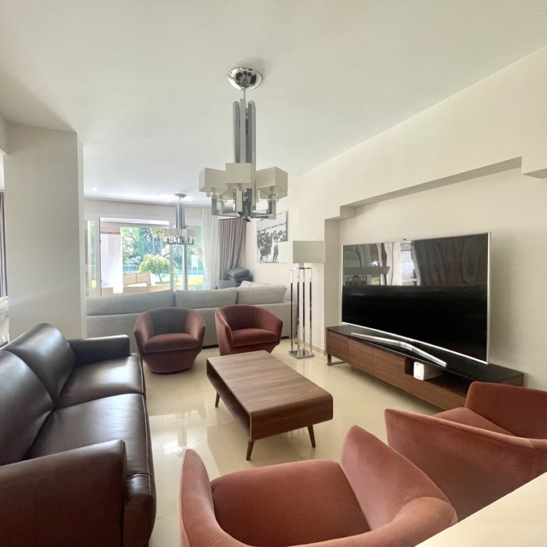 The apartment features six bedrooms, each with its own en-suite bathroom, providing ample comfort and privacy. The bright and spacious living room opens onto a large terrace with views of the garden and pool. The open-plan kitchen is fully equipped and includes a breakfast area and a large dining room.