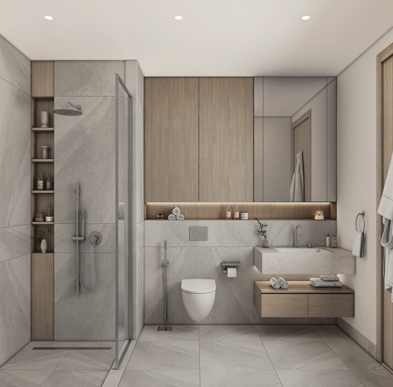 Bathrooms with walk-in showers, floating vanities, and modern, light-enhancing finishes