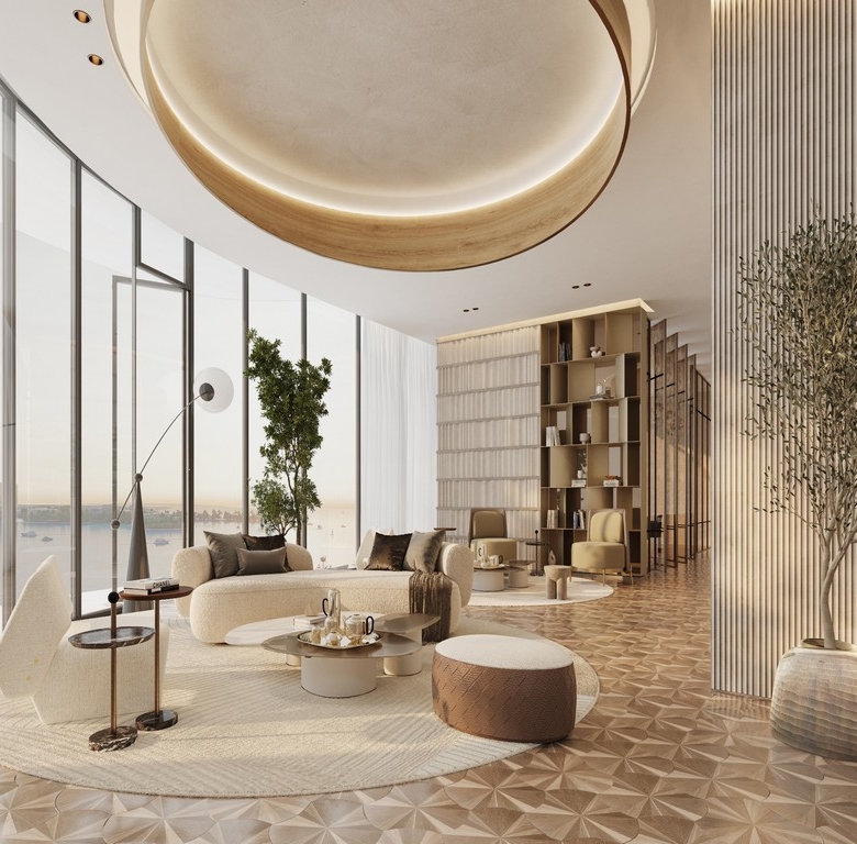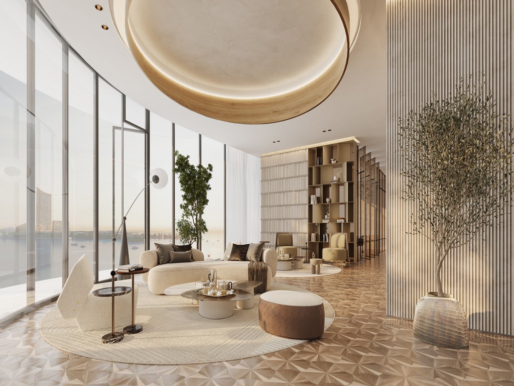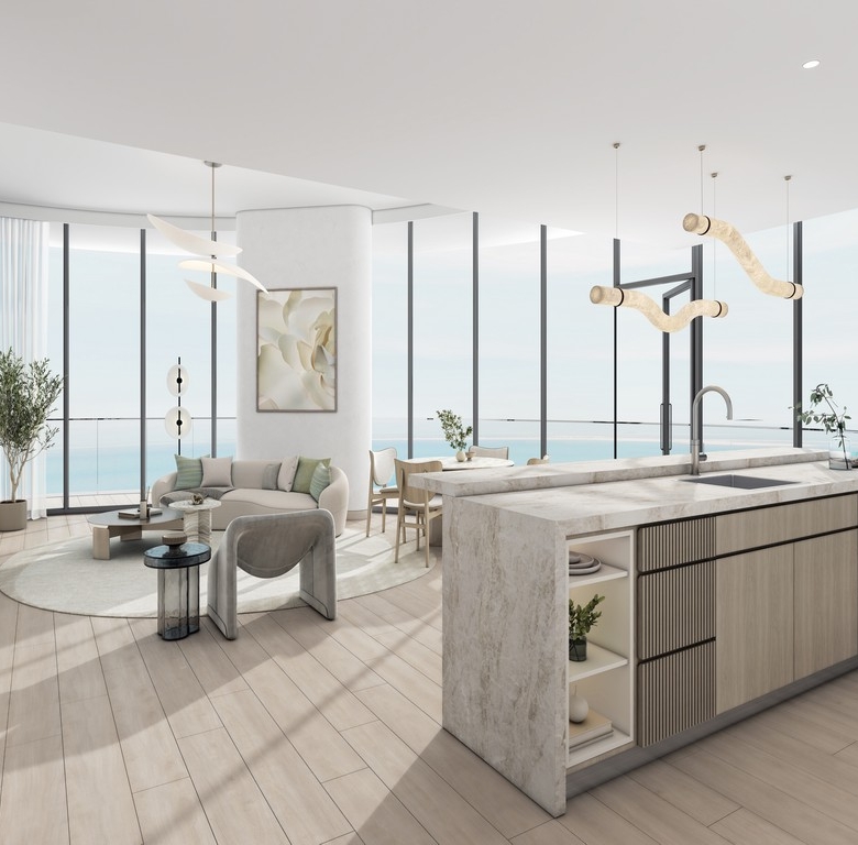 Bedrooms offer calming neutral palettes, floor-to-ceiling windows, and private balconies