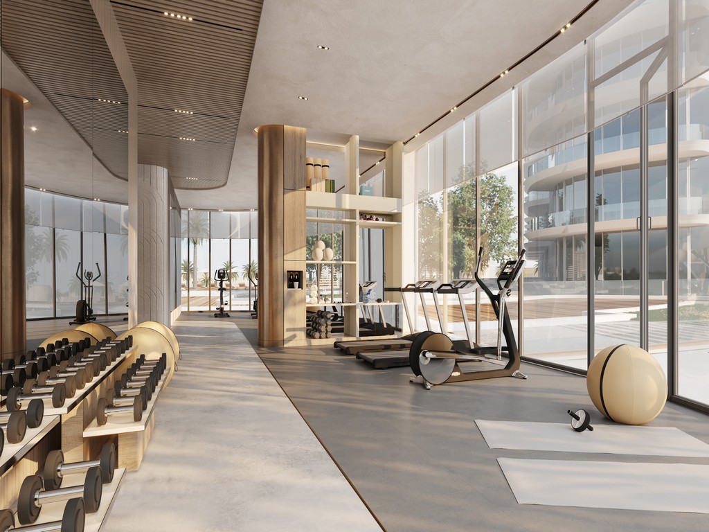 Fitness Studio with natural lighting, full-body workout zones, and chromotherapy showers
