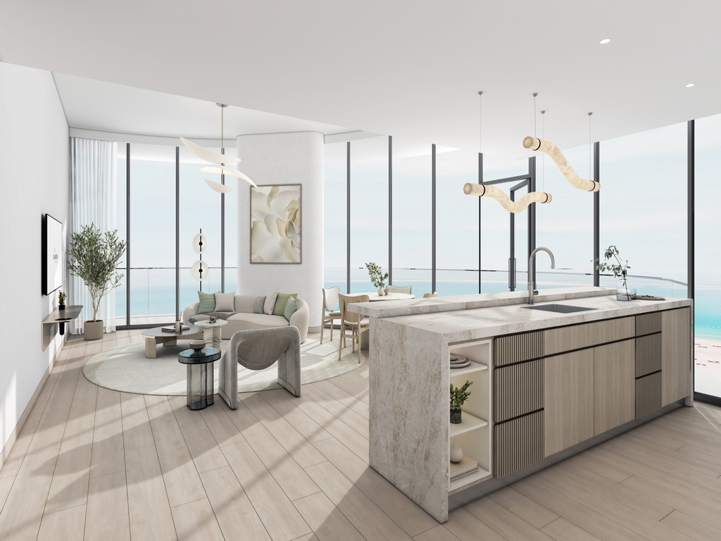Bedrooms offer calming neutral palettes, floor-to-ceiling windows, and private balconies