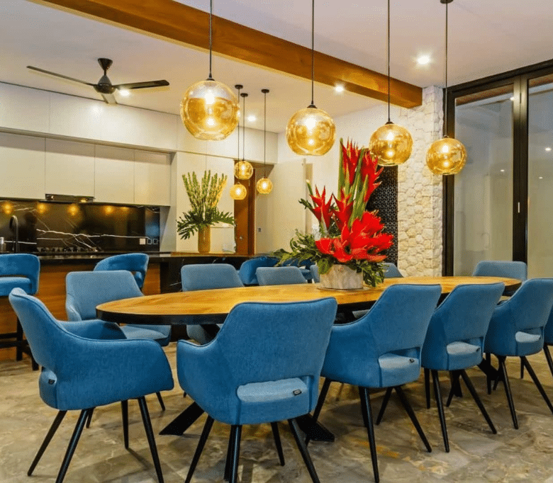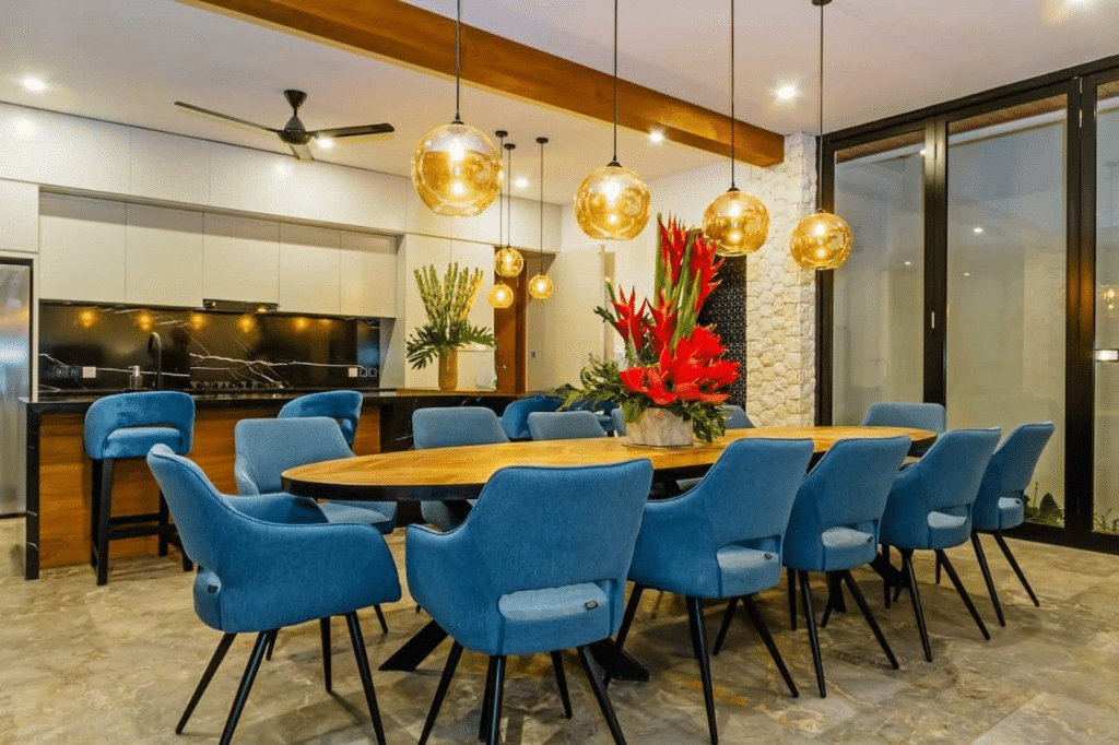 The kitchen is extremely well fitted-out, the living room is super comfy and the dining table is elegant. The gardens are rich, and the villa has got several indoor potted plants throughout, creating a nice private oasis vibe in the heart of Seminyak.