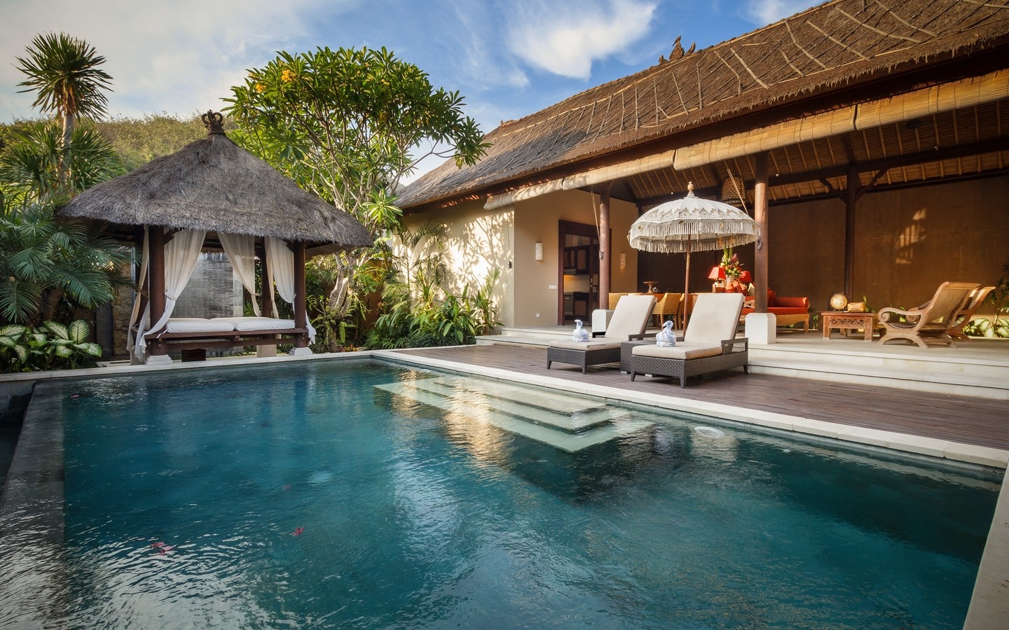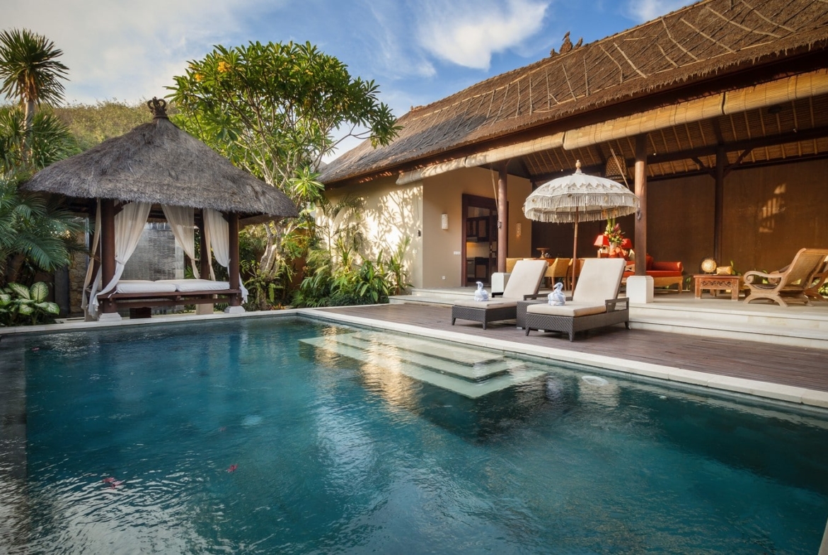 This multilevel complex of five, delightful FREEHOLD villas covers 2300sqm of land and is located just footsteps from the beach at the traditional fishing village of Seseh. Each 2-3-or-4-bedroom thatched villa is set within its own private garden, complete with mature trees, private swimming pool, an open-sided living & dining pavilion, a fully-equipped modern kitchen, and a relaxation pavilion. Three of the villas share ocean views and two overlook a small river and neighbouring rice fields. The property blends contemporary style and eco-friendly building concepts with classic Balinese and traditional influences. Each air-conditioned bedroom features a canopied bed and is adjoined by a glamorous en-suite bathroom. All of the villas are attractively furnished. Situated around a private courtyard with car parking space. A total of 14 bedrooms and 14 bathrooms makes the complex suitable for a yoga retreat or holiday group of up to 28 people.