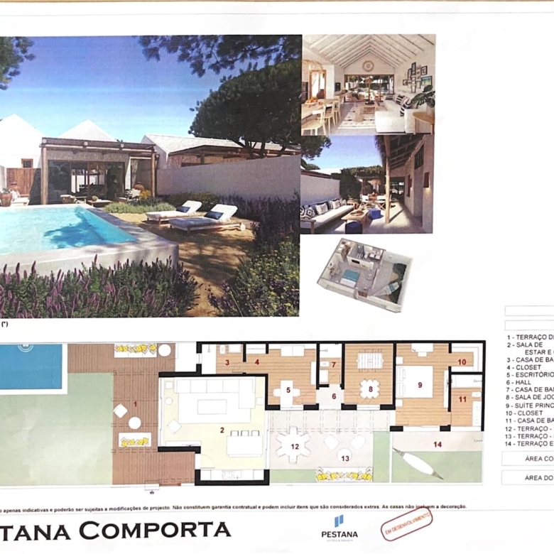 Semi-detached 3 bedroom villa in the development Pestana Comporta Village Residences. This project is under construction and the delivery is predicted to the summer of 2024. The villa, with a 95 sqm built area, is deployed in a 251.13 sqm plot of land. It offers an architecture and design in harmony with the atmosphere of the region, developing fully on the ground floor. It is composed by: - Suite (13,5 sqm) with closet (2.8 sqm), terrace and full private bathroom (5 sqm); - Office (9,3 sqm) with closet (1.8 sqm) and full private bathroom (3,9 sqm); - Games’ room (9,32 sqm); - Full private bathroom (2.9 sqm) (Both the office and the games’ room are converted into bedrooms.) - Living room in open space with equipped kitchen (29 sqm); - Outside there is a dining terrace, a terrace for leisure moments, a terrace with garden, and an ample wooden deck is developed to access the private swimming pool of this villa. Parking on the outside. This business is a resale, being made the transfer of the contractual position. All the services and equipment of the Pestana Comporta development will be available to the owners: privacy and security of a closed condominium, reception, gym and guarantee of hotel services. Located 2 km away from the beach and 200 metres away from the Village of Comporta. Porta da Frente Christie’s is a real estate agency that has been operating in the market for more than two decades. Its focus lays on the highest quality houses and developments, not only in the selling market, but also in the renting market. The company was elected by the prestigious brand Christie’s International Real Estate to represent Portugal in the areas of Lisbon, Cascais, Oeiras and Alentejo. The main purpose of Porta da Frente Christie’s is to offer a top-notch service to our customers. Property ID: PDF-PF32474 Price: €750,000 Property Size: 95.0 m2 Land Area: 251.0 m2 Bedrooms: 3 Bathrooms: 3 Year Built: 2024 Property Type: House Property Status: For Sale