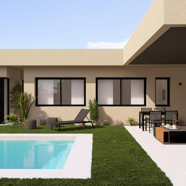 Villas for sale in Altaona Golf, Murcia The residential has different types of homes, ranging from 2 to 5 bedrooms, all built on one floor. Each property has a private swimming pool and the plots range from 350m2 to 600m2. This typology has 4 bedrooms and 4 bathrooms, private swimming pool, terrace, parking space inside the plot. All on one floor These homes are specifically designed to provide endless views of the golf course, lakes and distant countryside, from inside or outside. The south-facing gardens and terraces ensure you can enjoy the warm winter sun, and the generous glass windows provide additional views of the region from the comfort of the interior. - Optimal privacy- Green roofs- Energy efficiency A- Respect for the natural environment- Better design with larger rooms.- Innovative construction method- Common green areas Attractive and energy efficient, intelligently designed interiors combine aesthetics with comfort, efficiency and privacy, all based on a solid construction method and grounded in respect for its surroundings. Property ID: GH-307655-D Price: €476,500 Property Size: 139 m2 Land Area: 372 m2 Bedrooms: 4 Bathrooms: 4