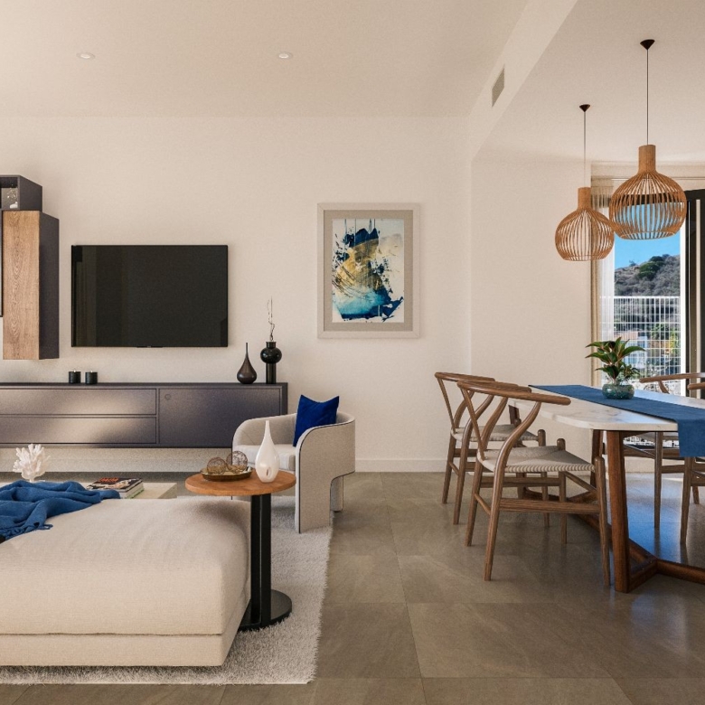 Alya Mijas is a new residential complex of 48 semi- detached houses in Mijas Costa, Málaga. The houses are distributed over two floors and have a private garden where you can enjoy the warm mediterranean climate. Located in Mijas. • In close proximity to the vibrant towns of La Cala and Calahonda. • Fuengirola is just a 10 minute drive away. • The upmarket resort of Marbella and the popular La Cañada shopping centre is a short 15 minute drive away. • Excellent transport connections by road, rail and air. The communal areas include a saline chlorination pool, gymnasium, co-working area, and landscaped garden areas. The residential development is gated to guarantee security and privacy.