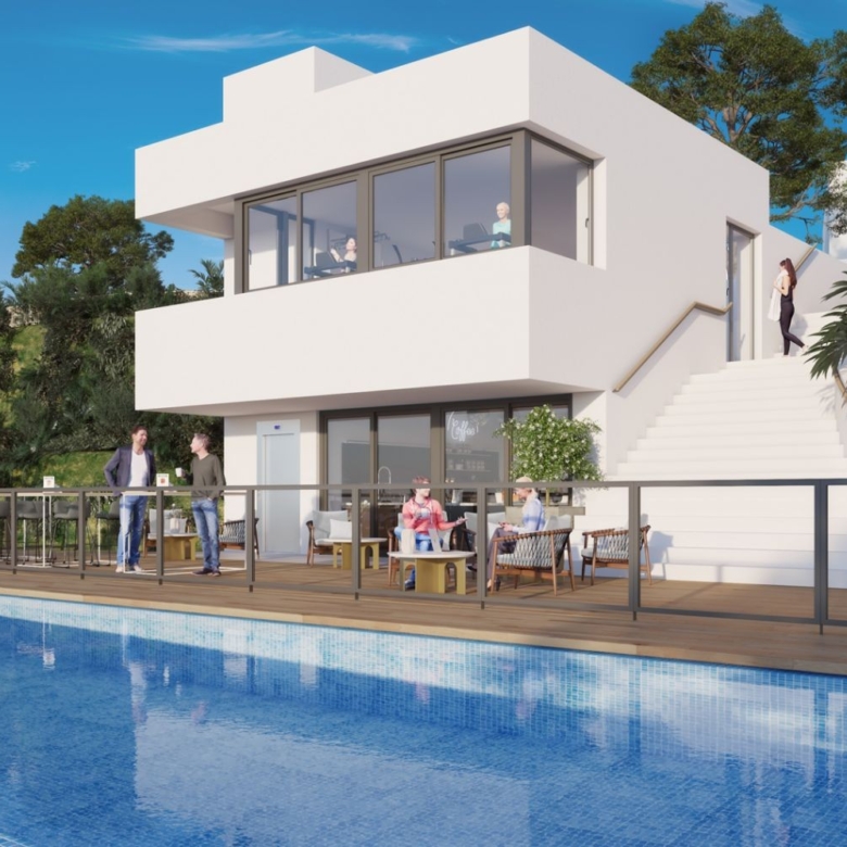 Alya Mijas is a new residential complex of 48 semi- detached houses in Mijas Costa, Málaga. The houses are distributed over two floors and have a private garden where you can enjoy the warm mediterranean climate. Located in Mijas. • In close proximity to the vibrant towns of La Cala and Calahonda. • Fuengirola is just a 10 minute drive away. • The upmarket resort of Marbella and the popular La Cañada shopping centre is a short 15 minute drive away. • Excellent transport connections by road, rail and air. The communal areas include a saline chlorination pool, gymnasium, co-working area, and landscaped garden areas. The residential development is gated to guarantee security and privacy.