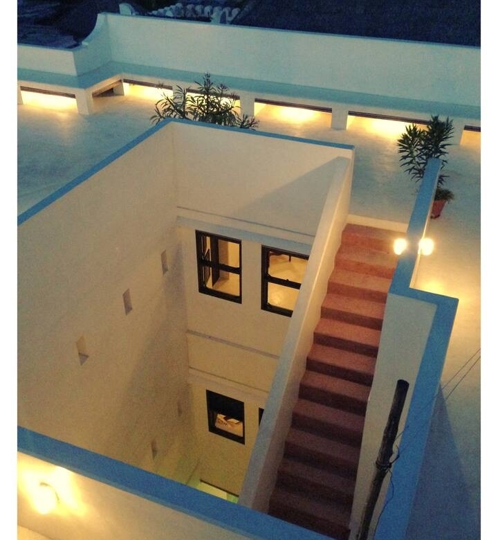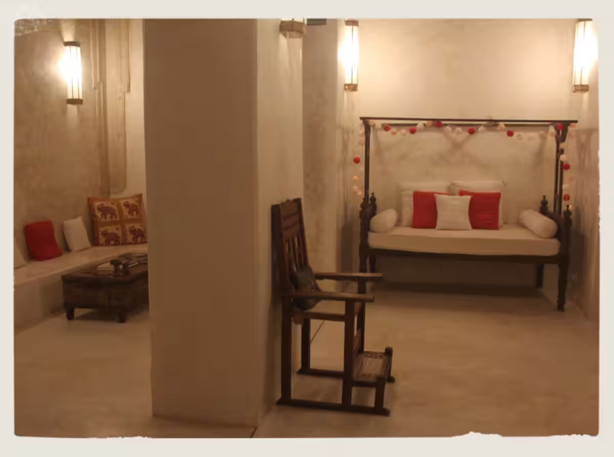 The ground floor of Andavelo House is designed for both functionality and guest comfort. Upon entering, you are greeted by a welcoming entrance hallway that leads into the various communal spaces. The heart of the floor is a large, semi-sectioned dining and common room/relaxing area, providing ample space for guests to unwind, socialize, and enjoy meals. The dining area, conveniently located close to the kitchen, can comfortably seat a total of 14 people around locally made Lamu-designed tables and chairs of high quality, reflecting the region’s unique aesthetic.