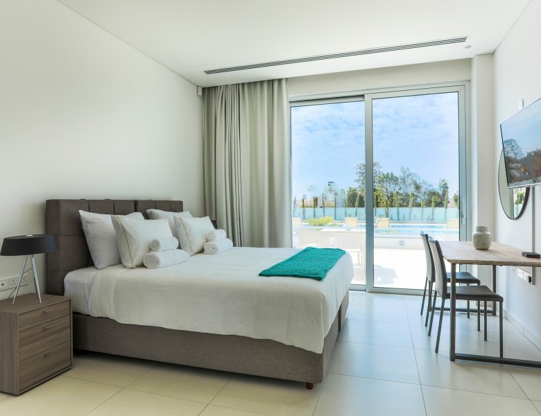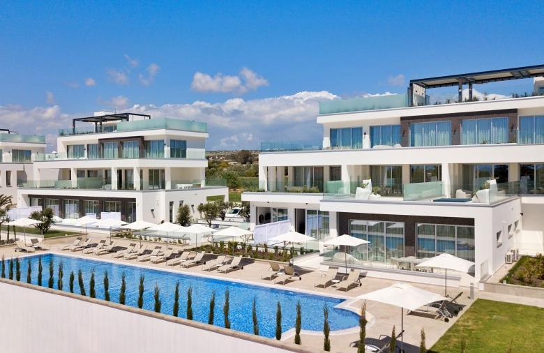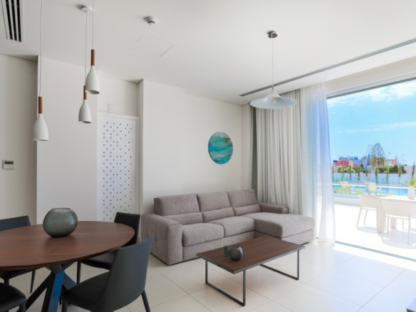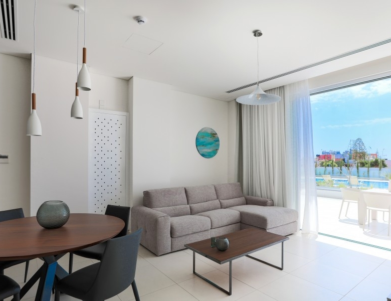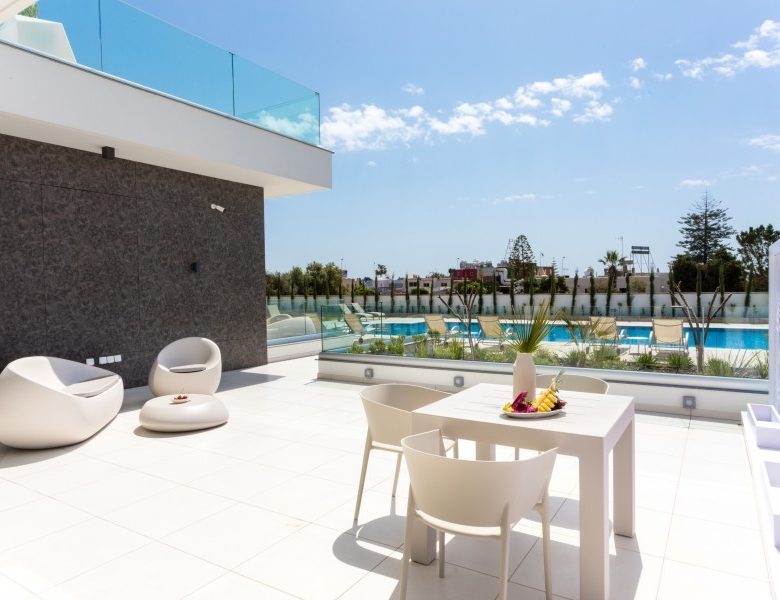A modern, low-rise development in the heart of Ayia Napa, a renowned beach resort on Cyprus’s southeastern coast. This gated complex is conveniently located within walking distance of restaurants, shops, banks, and a medical clinic, with the sandy beach just 500 meters away and Larnaca International Airport a 35-minute drive.The block comprises five units: two 2-bedroom ground-floor apartments, two 1-bedroom first-floor apartments, and a spacious 3-bedroom penthouse with a roof terrace with a starting price at €350,000. Ranging from 90m² to 159.3m², the units feature high-quality, energy-efficient, earthquake-resistant construction, along with stylish finishes, air conditioning, heating, fitted wardrobes, and double-glazed windows. Residents have access to a 25.5m x 7m communal pool with a sun terrace and designated parking spaces. Fully furnished and ideally located, The project is an excellent investment opportunity for those seeking vacation rentals or a luxurious getaway. The project can be sold as a whole or per unit.