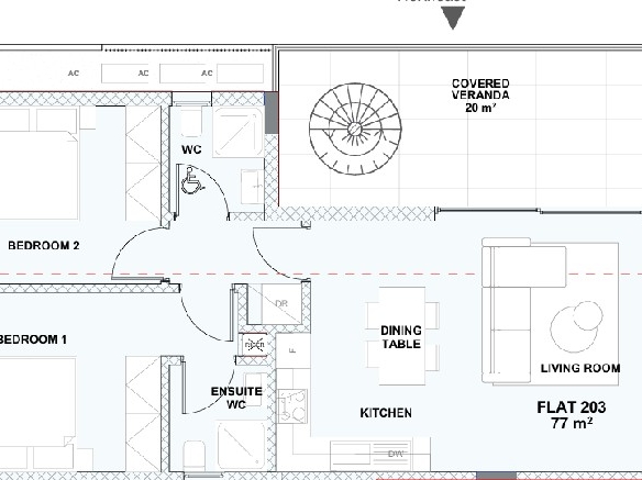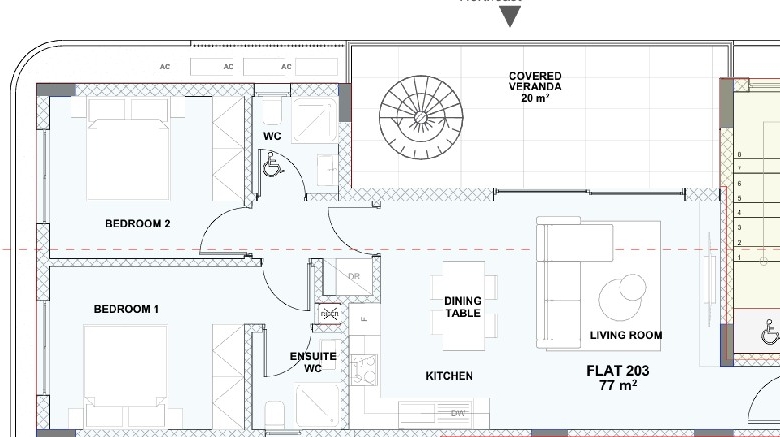 The project boasts sixteen apartments two bedroom & two bathroom apartments – all with spacious and contemporary living areas. There are two apartments per storey – ensuring optimum privacy for potential buyers. The eight floor apartments benefit from individual private and luxury roof-gardens with amazing views of the lovely Neighborhood. Each apartment has one parking bay and a storage room on the ground level. Delivery-July 2026