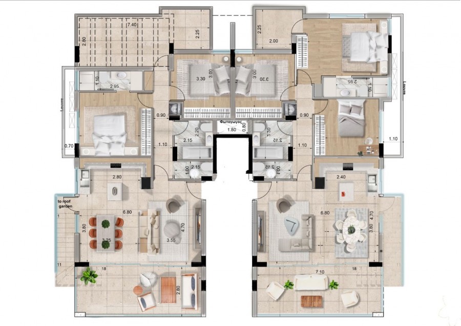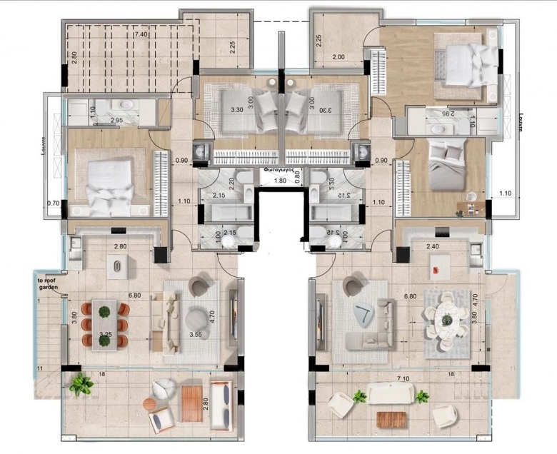 This modern 2-bedroom, 4-bathroom apartment is designed to offer both luxury and functionality, featuring an Energy Efficiency A certification for sustainability and reduced energy costs. Each bedroom includes its own en-suite bathroom for privacy, complemented by a stylish common bathroom and a guest bathroom for added convenience. The apartment boasts large covered verandas for outdoor relaxation, double-glazing thermal aluminum windows and doors for superior insulation and noise reduction, and a concealed laundry station for practicality. Additional features include a linen closet, covered parking, and a private storage room. Situated in a quiet residential area, it is within walking distance to Larnaca Metropolis Mall, supermarkets, bakeries, gyms, and hospitals, and offers easy access to major highways. A nearby park adds to its charm, making it an ideal choice for modern living with all the comforts and amenities close at hand.