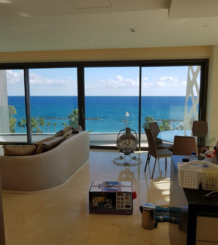 A brand new front line 3 bedroom apartment for sale in Mouttagiaka, Limassol. It is located on the 6th floor of an 18 storey building right on the beach with panoramic sea views. The apartment is fully furnished with high end finished and equipped with underfloor heating, VRV air-conditioning and a smart home system. Some luxuries the apartment offers is a pool, gym, and spa. There is 5* hotel facilities with a 24hr reception, concierge desk and top of the line restaurant in the building.