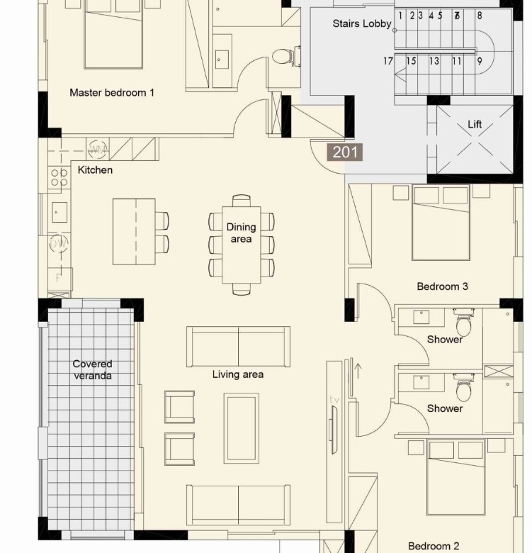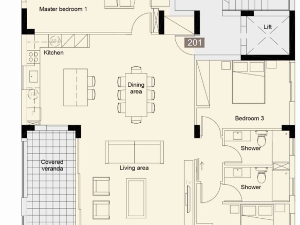 This is a three bedroom spacious apartment on its own floor. It enjoys an open plan kitchen area connected with a spacious living and dining area that have access to a covered veranda. The central location of the of the development offers unique access to all amenities and services, blue flag beaches, hotels, resorts, international golf courses, entertainment venues and shopping malls. The location will give future residents easy access to the Paphos International Airport and the Paphos to Limassol Highway.