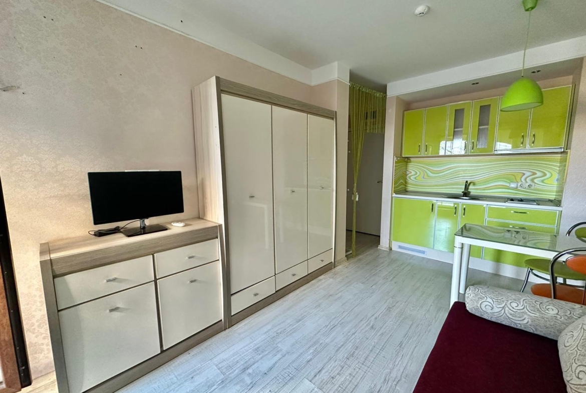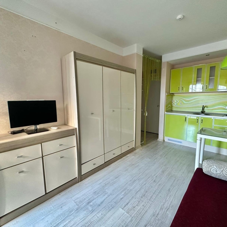 The studio is fully furnished and equipped, featuring a sofa, air conditioning, a dining table with chairs, a fitted kitchen, built-in wardrobes, a TV, and a modern bathroom with a shower cabin. From the balcony, you can enjoy a pleasant view of the landscaped courtyard. A small corridor ensures a practical layout. The apartment is ready for immediate occupancy and ideal for holidays or rental.