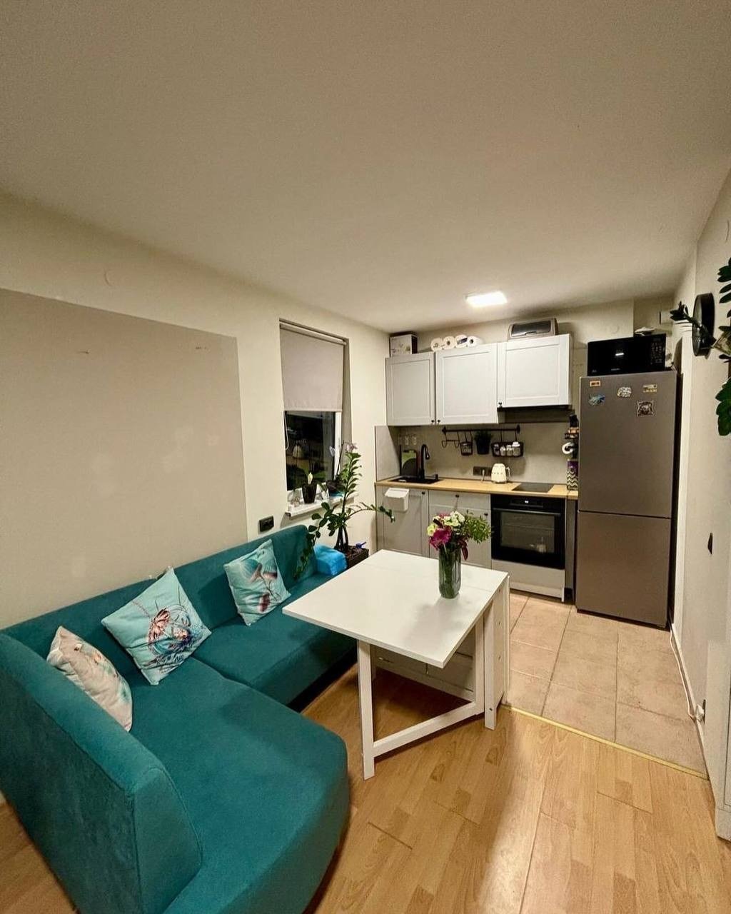 The apartment boasts a stylishly designed interior. On the left side of the entrance, there is a TV and a dark-colored wardrobe. In the center of the studio, there is a large double bed, air conditioning, a sofa, a coffee table, and a house plant. The kitchen is compact yet cozy and functional, equipped with an oven, a microwave, and a large fridge. The bathroom has a fresh, modern look with new fixtures and includes a washing machine. The apartment also has a spacious balcony that accommodates a set of outdoor furniture. This is an excellent choice for both short and long stays.